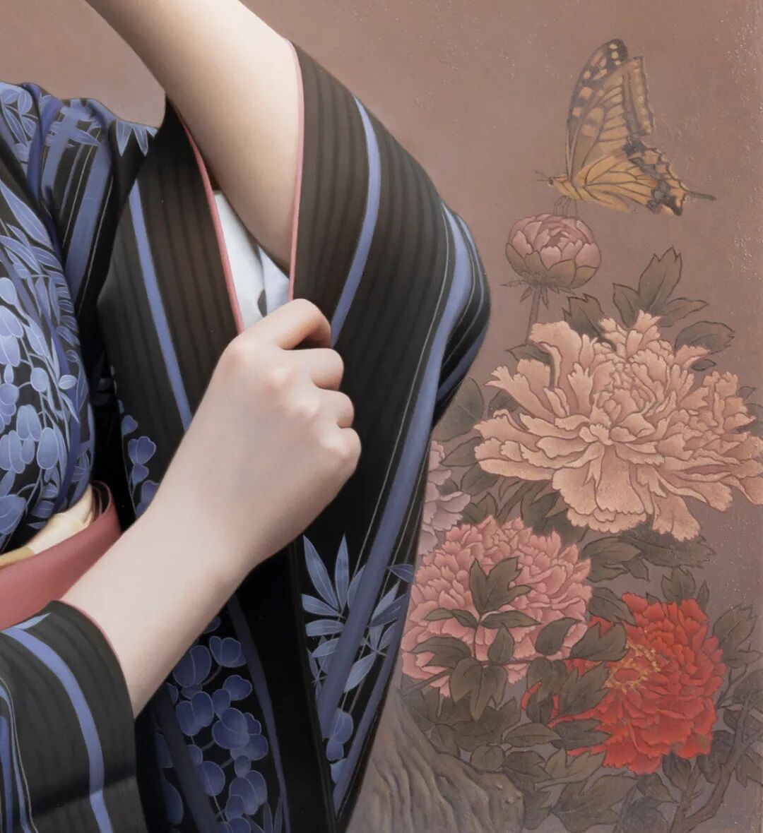 他用了大约一个月的时间完成了每幅油画肖像,他使用真实生活中的模型作为每幅作品的起点,但他在绘画时经常将它们“理想化”。一些妇女穿着传统和服,戴着花饰,衬托着华丽的壁纸。其他人则穿着休闲服,经常在家里摆好姿势,从窗户向外张望。在其他作品中,可以看到女孩们完整地站在迷人的森林或花园里,一个女人在秋天的雾蒙蒙的森林里摆姿势,而一只白色猫头鹰栖息在她身后的树上
