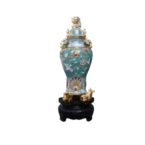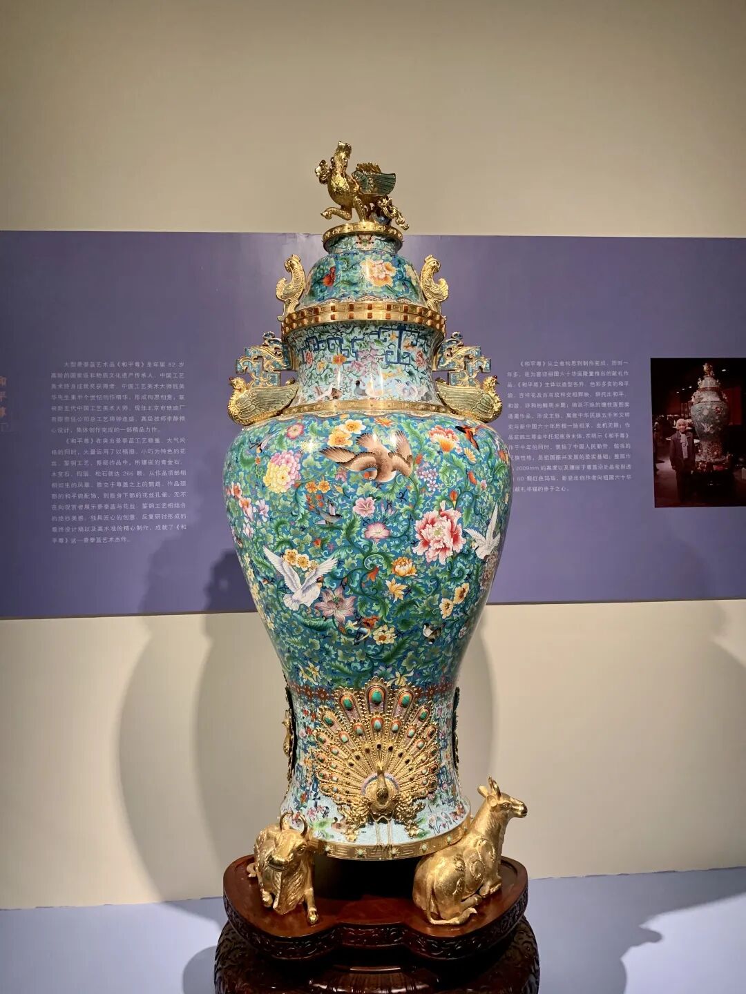 此件作品为2017年1月18日,中国政府向联合国日内瓦总部赠送,现收藏于联合国日内瓦总部万国宫的景泰蓝《盛世欢歌》大瓶同款,作品图案由孔雀、牡丹、玉兰、和平鸽等构成,在中国传统文化中象征着安定祥和、繁荣富强。瓶身点缀经典纹样体现了中外文明的交融共生,传递了中国包容、合作、共赢的理念。