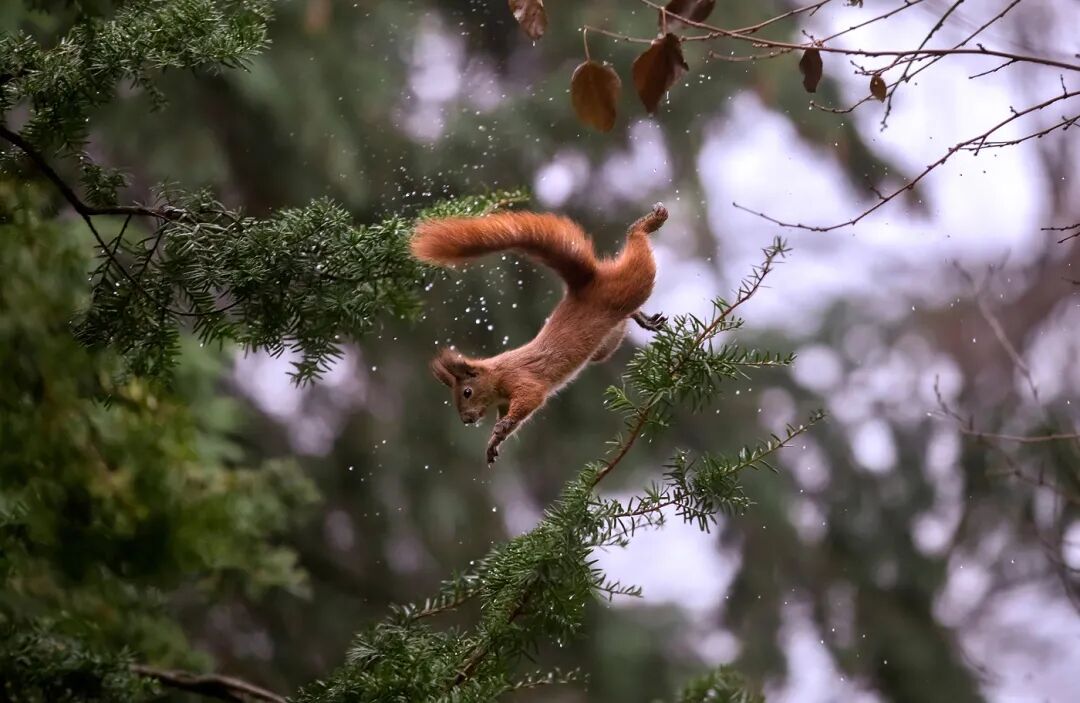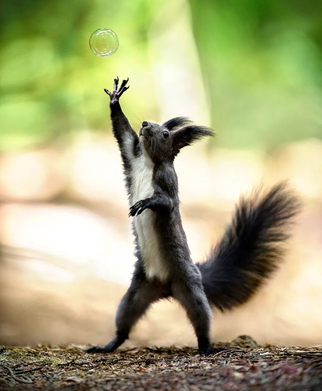 Sergey Polyushko说:“这个森林中的松鼠都十分温顺。我们拿了一袋坚果,当我的朋友吹泡泡时,松鼠抬爪试图抓其中一个泡泡。”