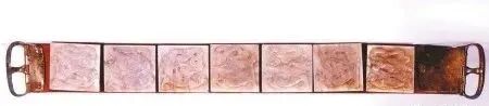 经专家们仔细鉴定,这件一千多年前的玉带所使用的材料是当时最贵重的玉石――和田玉。它是由七方銙、一方铊尾、两节革带和一对银扣组成。按理说,作为皇帝的御用腰带,应该是九方銙,雕九条龙才合乎情理,而这条玉带只有七方銙,雕刻了八条龙,这是为什么呢?马继贤老师解释说,可能在当时,前蜀的礼仪方面还没有形成规定完整的制度。玉大带上雕有精美的蟠龙浮雕图案,七条龙相对排列,考古学家在铊尾的背面发现刻有铭文,字迹清晰可辨,记录了一千多年前在前蜀宫中发生的一件大事,即公元915年10月27日深夜,前蜀后宫发生的火灾。