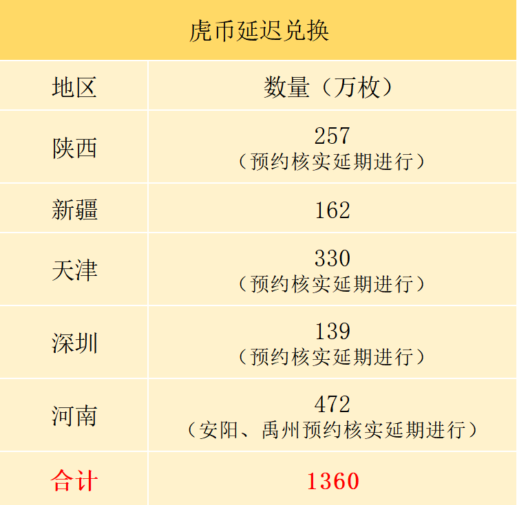 最近因为疫情防控的原因,已经有多地公布虎币延迟兑换,除了之前公布过的陕西、新疆、天津、深圳,河南也正式发布了延迟公告。