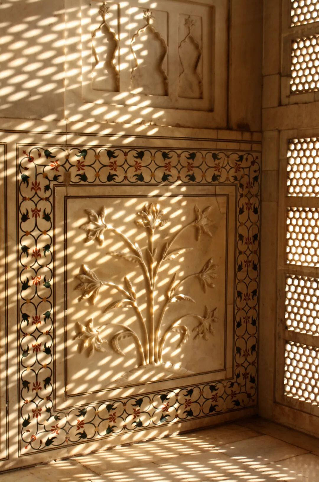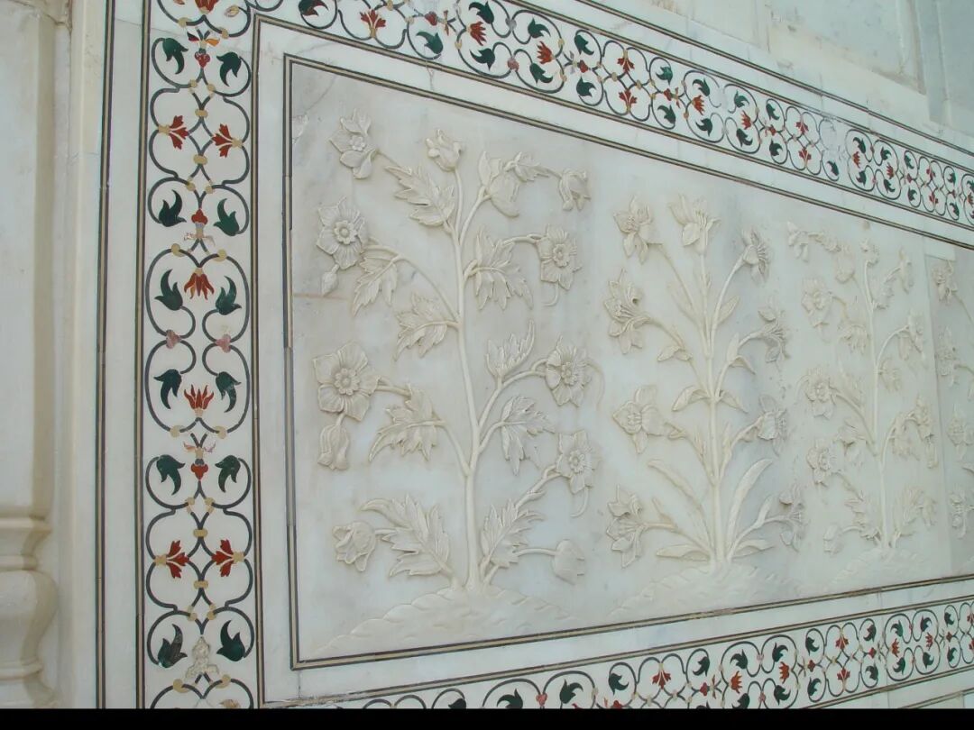 泰姬陵用于镶嵌的的宝石和半宝石多达28种:旁遮普的碧玉、巴格达的玛瑙、也门的水晶、中国的水晶和绿松石、斯里兰卡的青金石和蓝宝石、红海的珊瑚、本德尔坎德的石榴石、潘纳的钻石、波斯的缟玛瑙、法泰赫普尔·西克里的鸡血石……![]()