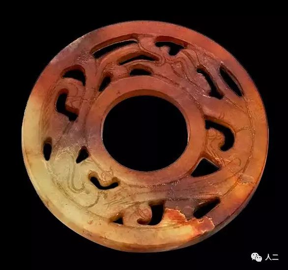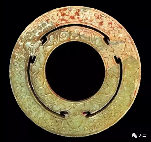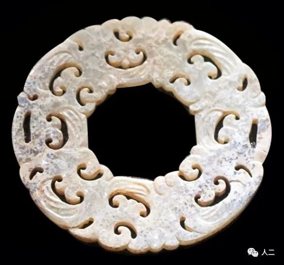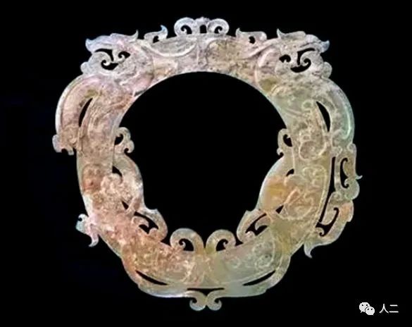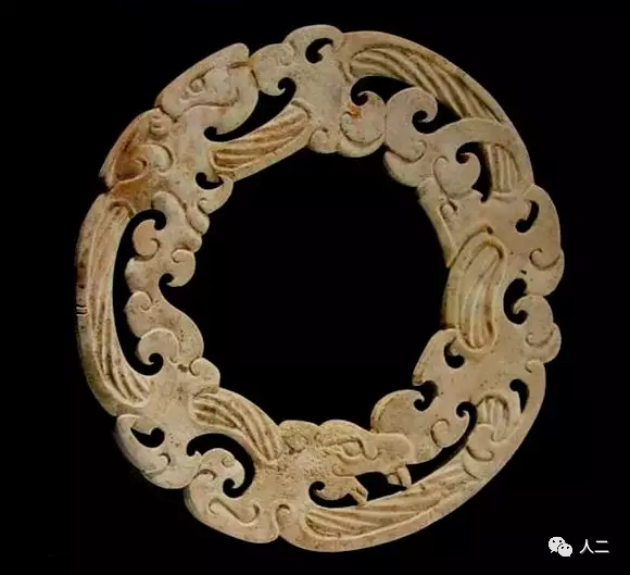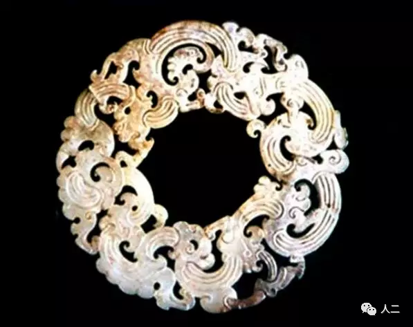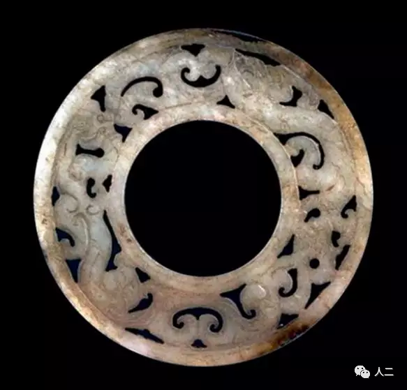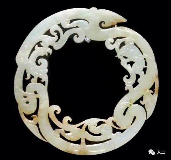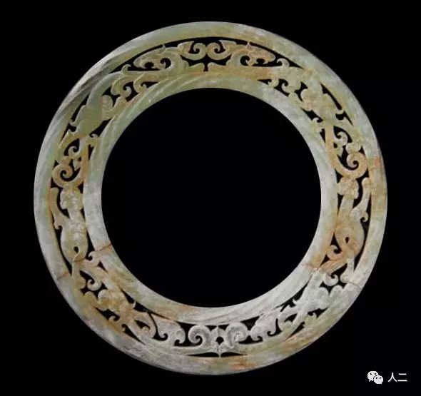 这件山东临淄商王村战国晚期齐国墓出土的镂雕重圈玉环,和田白玉,外直径11厘米、内直径6.4厘米、厚0.3厘米,镂雕二龙二螭。广州西汉南越王墓出土的两件重圈玉环十分经典。