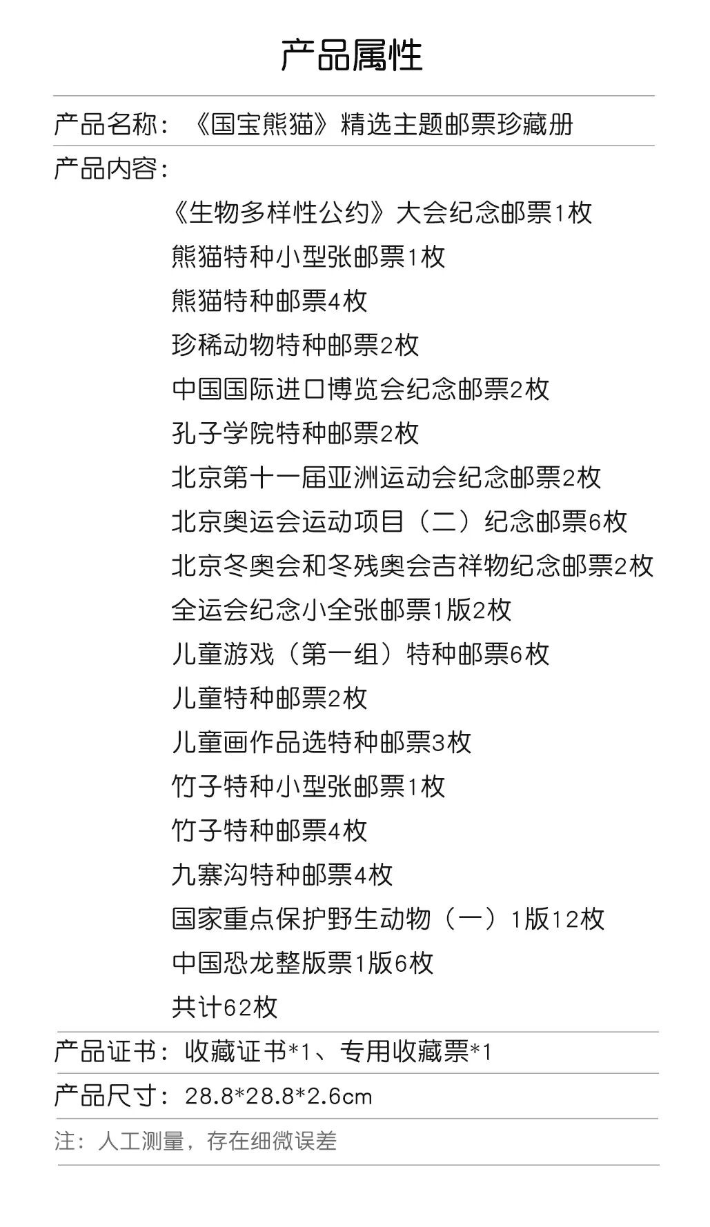 《生物多样性公约》大会纪念邮票1枚 熊猫特种小型张邮票1枚 熊猫特种邮票4枚 珍稀动物特种邮票2枚 中国国际进口博览会纪念邮票2枚 孔子学院特种邮票2枚 北京第十一届亚洲运动会纪念邮票2枚 北京奥运会运动项目(二)纪念邮票6枚 北京冬奥会和冬残奥会吉祥物纪念邮票2枚 全运会纪念小全张邮票1版2枚 儿童游戏(第一组)特种邮票6枚 儿童特种邮票2枚 儿童画作品选特种邮票3枚 竹子特种小型张邮票1枚 竹子特种邮票4枚 九寨沟特种邮票4枚 国家重点保护野生动物(一)1版12枚 中国恐龙整版票1版6枚 共计62枚