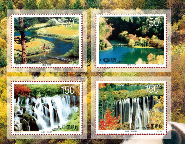 邮票图案采用摄影作品,展现了九寨沟的自然景观。