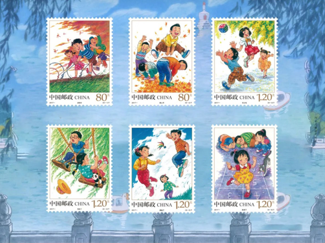 这些元素运用在邮票上,和谐生动,细细观赏,慢慢体会孩子们的喜悦之情。