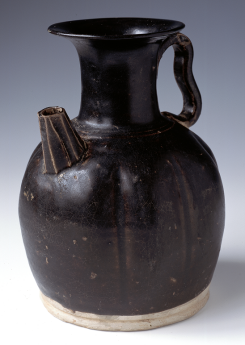 黑釉瓷是以富含氧化铁及少量锰、铬等氧化剂为呈色元素的单色釉瓷。一般来讲,釉中氧化铁的含量高达8%以上。黑釉瓷最早创烧于浙江德清、上虞一带,东晋时的德清窑已能生产色黑如漆的鸡首壶、盘口四系壶等。至隋唐五代,长沙窑、寿州窑、邛窑等均烧造黑釉产品。宋元时期的黑釉瓷,以南方地区建窑、吉州窑为代表,因“茶色白,宜黑盏”的斗茶之风而兴盛,产品质量上乘,釉色乌黑锃亮,北方则以定窑黑釉瓷最为出色,陕西、河南等地均有仿烧。黑釉瓷是中国古陶瓷的重要组成部分,发展至今仍备受推崇。