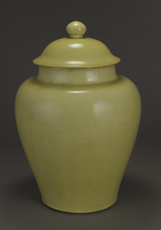 黄釉瓷分为以氧化铁为呈色剂的高温黄釉瓷和以氧化锑为呈色剂的低温黄釉瓷。目前发现最早的高温黄釉瓷出自唐代寿州窑,宋元时期发展低迷,明代黄釉瓷再次兴起,宣德黄釉发色沉稳,常作为青花的底釉使用,弘治时期出现“娇黄”釉瓷,釉色娇嫩,为一代名品。“娇黄”等低温黄釉瓷器均为两次烧成,即先高温烧成白瓷,然后再施黄釉,入窑低温焙烧而成。由于采用浇釉手法,所以又称“浇黄”。至清代,黄釉瓷器进一步发展,出现了浓淡不一的黄釉,如鳝鱼黄、鹅黄、柠檬黄等。黄釉是明清宫廷专用的一种釉色,且宫廷内部又因身份不同而使用不同品种的黄釉瓷,等级森严。