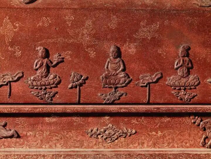大盒上的部分髹饰是立体的,以漆灰堆塑了佛像、神兽、飞鸟、花卉等,并镶嵌以珍珠;底纹以描金的技法,绘有花草、迦陵频加、各类乐器等;函底还有金书“大宋庆历二年”(1042年)。