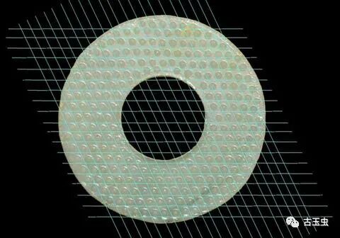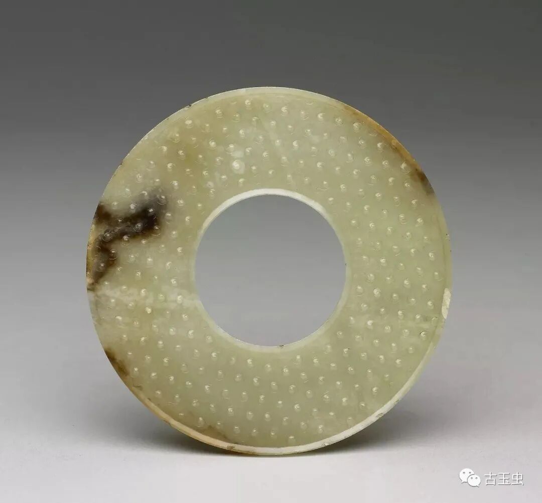 外径14厘米,内径4.8厘米,厚0.3厘米 1979年长丰杨公战国墓出土 现藏安徽省文物考古研究所。青白质,偏白,器扁圆,两面满饰谷纹,内外缘分别饰一道阴刻廓线,制作规整,表面抛光细致,有较强的玻璃光泽。