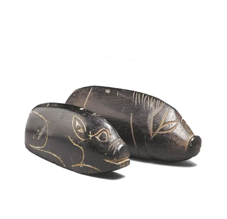 炭精又称煤玉,严格意义上讲,炭精算不得玉。炭精虽不及玉般坚硬,却也坚硬如石,细腻似玉,较之玉石,炭精价格相对低廉,是一种上好的雕刻材料。这种材质的随葬器物在甘肃魏晋墓葬中多有出土。这两只嘉峪关市出土的猪形握算得炭精明器中的精品。黑亮的猪玉握比那汉八刀的玉握猪可要逼真得多了,这是两只卧着的猪,长圆形的身体,线刻的口唇、眉目、耳朵、四肢,惟妙惟肖,一看就是两头憨态可掬萌萌哒的猪。