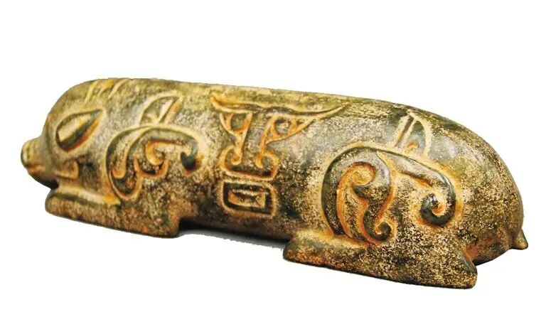 出土于正宁县汉墓的猪形玉握器身为圆棒形,平底,前后两端齐头,器身前部稍低于后部。玉猪眼睛自头顶分向两侧,呈树叶形,器背呈圆棒状,向两侧雕出肩胛和两对腿蹄,四腿均向前伸,作竖卧状,后背末端条形尾上有凹槽,平底上有表示前后腿的刻槽。这只玉握一看就是典型的“汉八刀”雕刻技法,雕琢玉石时用刀干净利落,毫无辅刀的痕迹,刻线似为一面坡形,整体形象大气拙朴,虽简练却神韵俱在。别看这所谓的“汉八刀”的治玉刀工简单,后世的玉雕工匠想模仿都模仿不来呢!即便是模仿了“八刀”的形,也模仿不了“八刀”的韵,这种韵大气拙朴、热情奔放,饱含着旺盛的生命力,就如这猪形玉握,形象远没有那对晋代的炭精猪握雕得逼真,但其形不似却神似,这种神似比之形似给人以更强烈的审美震撼!