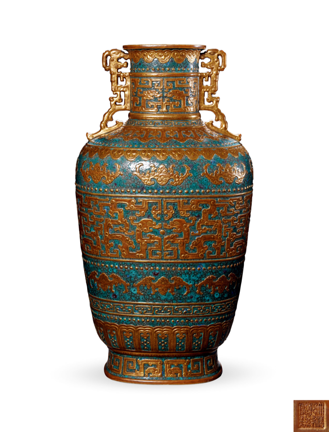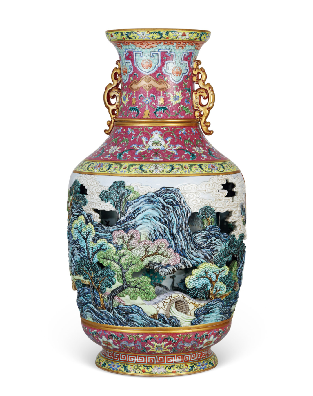 北京保利2021春季拍卖会 禹贡Ⅱ—乾隆御制洋彩雕瓷有凤来仪大转心瓶 Lot 51531.《中国-三个皇帝》,伦敦皇家艺术学院,伦敦,2006年,页296,编号222;2.《首届世界华人典藏大展》,首都博物馆,北京,2010年,页48-49。“中国-三个皇帝”,伦敦皇家艺术学院,伦敦,2006年,编号222;“首届世界华人典藏大展”,首都博物馆,北京,2010年。1.苏格兰贵族家族旧藏,得自1875年,并由后代递藏;清乾隆 御制胭脂红地番莲花卉套炉钧釉太平有象转心瓶