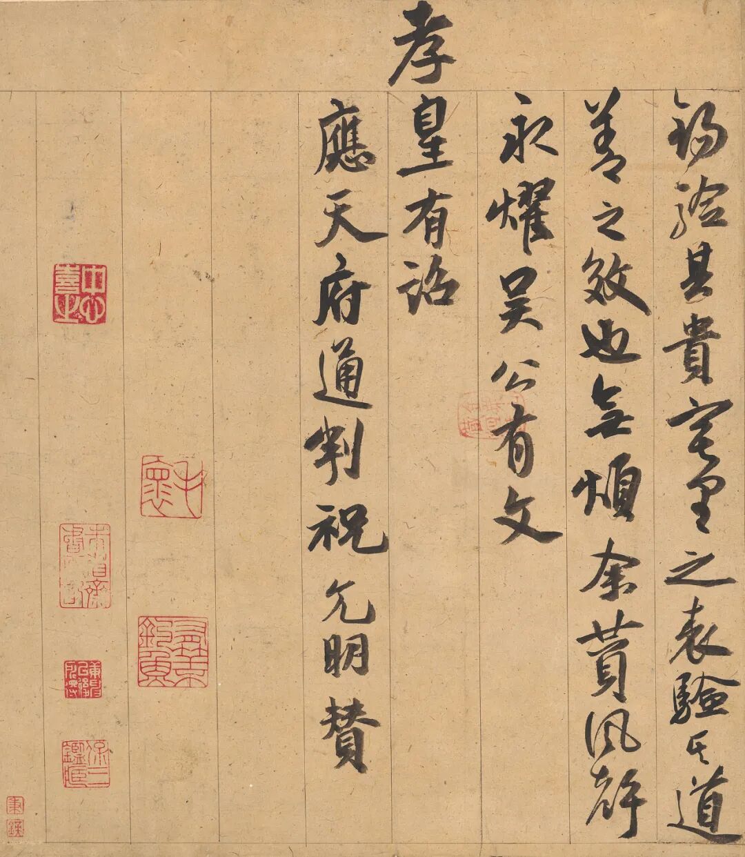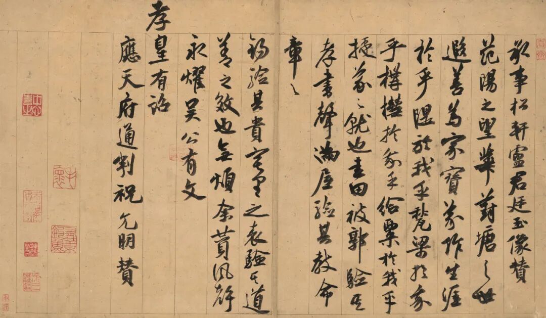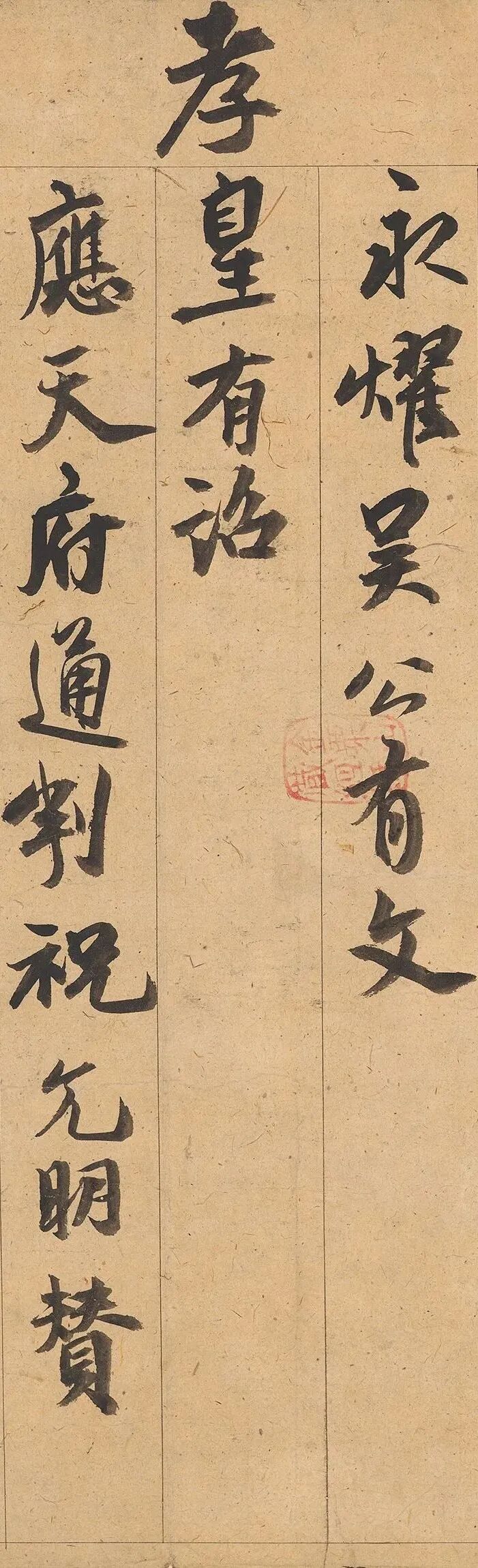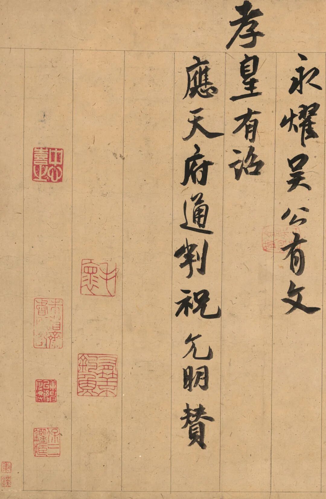 面对如此高规格的书写用具,无怪乎祝氏会选用严肃工整的书体以示匹配。而从此作平阙得当,”孝皇有诏”保留抬头等诸多细节中不仅体现时代特征,更表达出祝氏严格恪守书写格式,一丝不苟完成此作的认真态度。纸精墨妙、文佳书绝,是距今五百年前祝允明对待得意之作力求完美的证明。