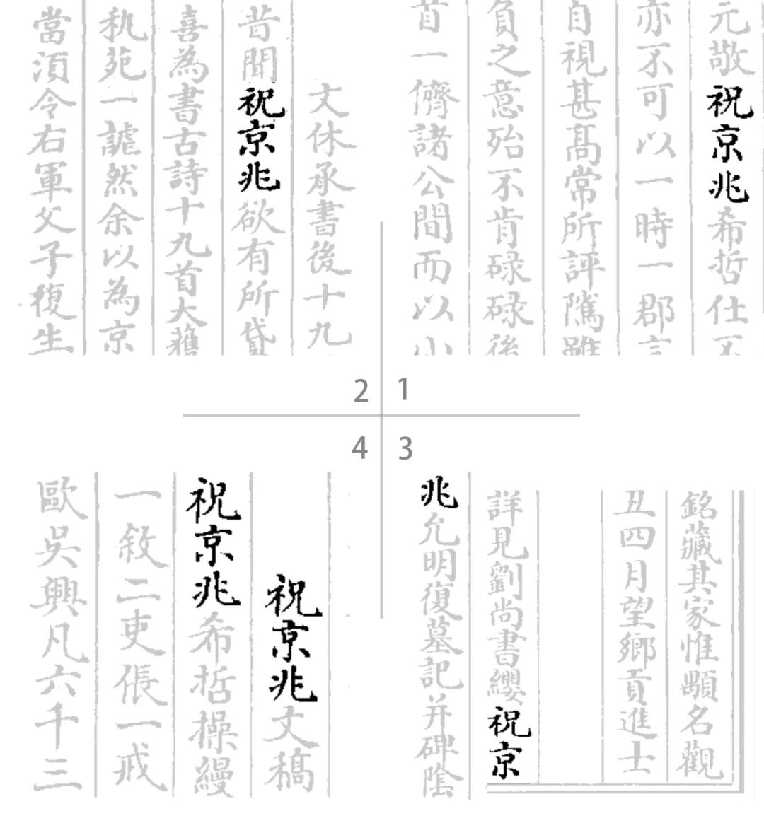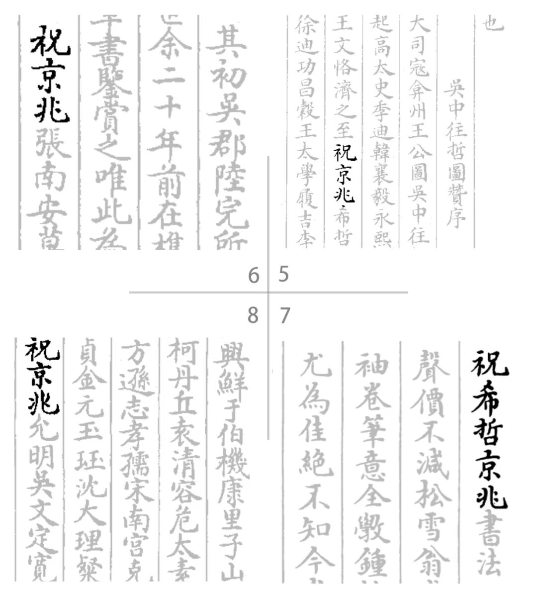 自同时期文征明《莆田集》(下图1)、稍晚的文嘉致敬祝允明的《书后十九首》(图2)、钱谷《吴都文粹》(图3),到明代王世贞《弇州四部稿》(图4)、胡应麟《少室山房集》(图5)、董其昌《画禅室随笔》(图6)、张丑《清河书画舫》(图7)、文震亨《长物志》(图8),在指称祝允明时均冠以祝京兆之名,至清代《石渠宝笈》、《秘殿珠林》则后世皆称祝京兆。