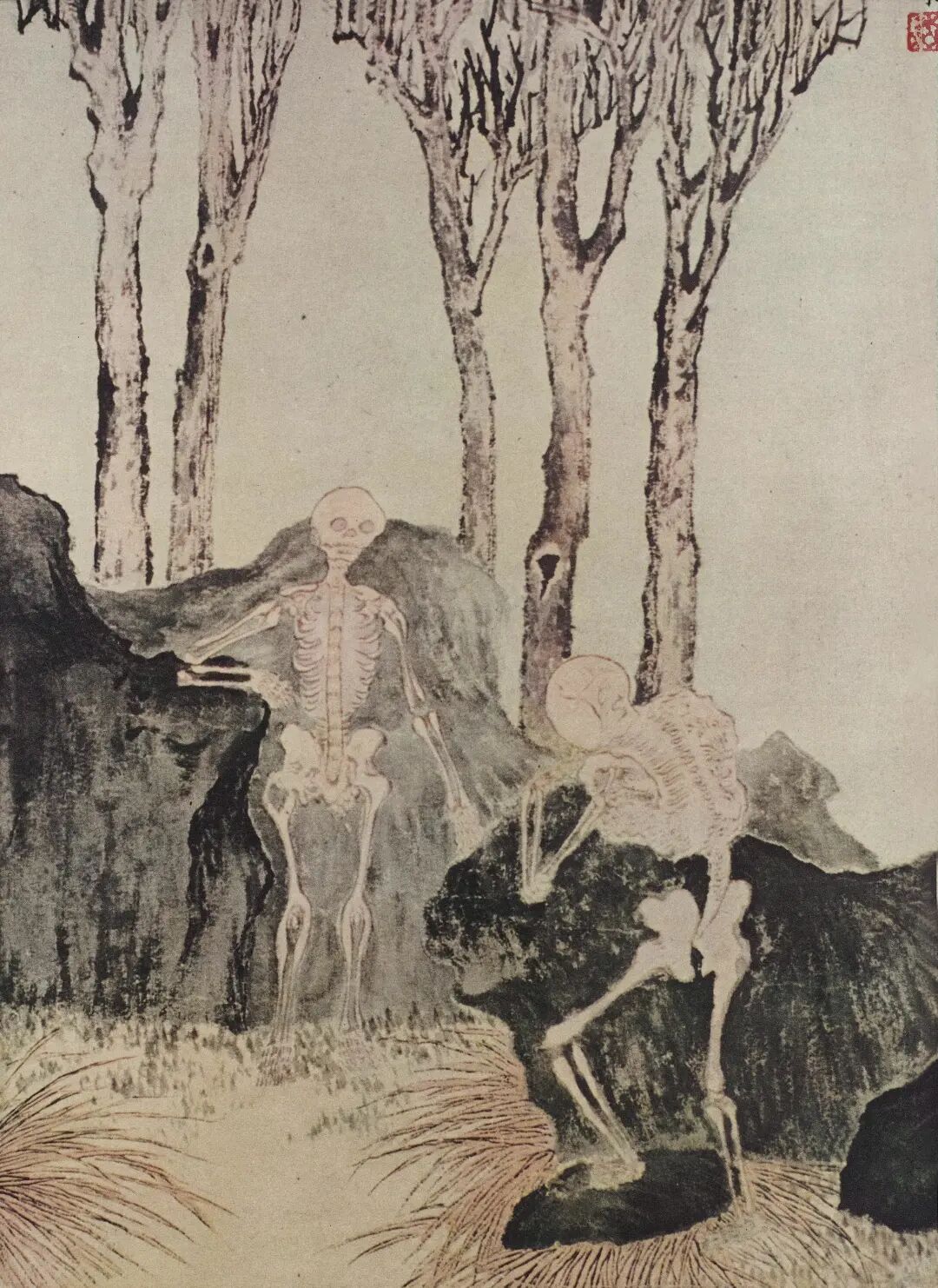 西晋陆机有言:“宣物莫大于言,存形莫善于画。”“鬼”图像的描绘也早有源起,战国时期韩非子对画之难易就有“犬马最难,鬼魅最易”的回答。《唐朝名画录》记载唐代吴道子作《地狱变相图》鬼相阴惨、寒气逼人,使得“京都屠沽渔罟之辈,见之而惧罪改业者往往有之”。随着文人画的兴盛,画家的个人情怀在画面中得到更多抒发,“鬼”形象所蕴含的隐喻内容也随之丰富。南宋李嵩绘《骷髅幻戏图》的诡异场景,在死生、贫贵的推拉中暗讽人间喜悲的困苦;元代画家龚开画《中山出游图》描绘以钟馗为首的众鬼出行景象,荒诞诙谐的表现尽显对社会的无奈嘲讽;明陈洪绶《钟馗图》古怪形象与静谧神情流露出无限永恒的情思;清代金农、罗聘、黄慎、华喦、钱慧安等人均有鬼画题材图画,其中罗聘画鬼众多,所绘《鬼趣图》阴森缥缈、鬼气凛人,夸张嗔怪、最负盛名。