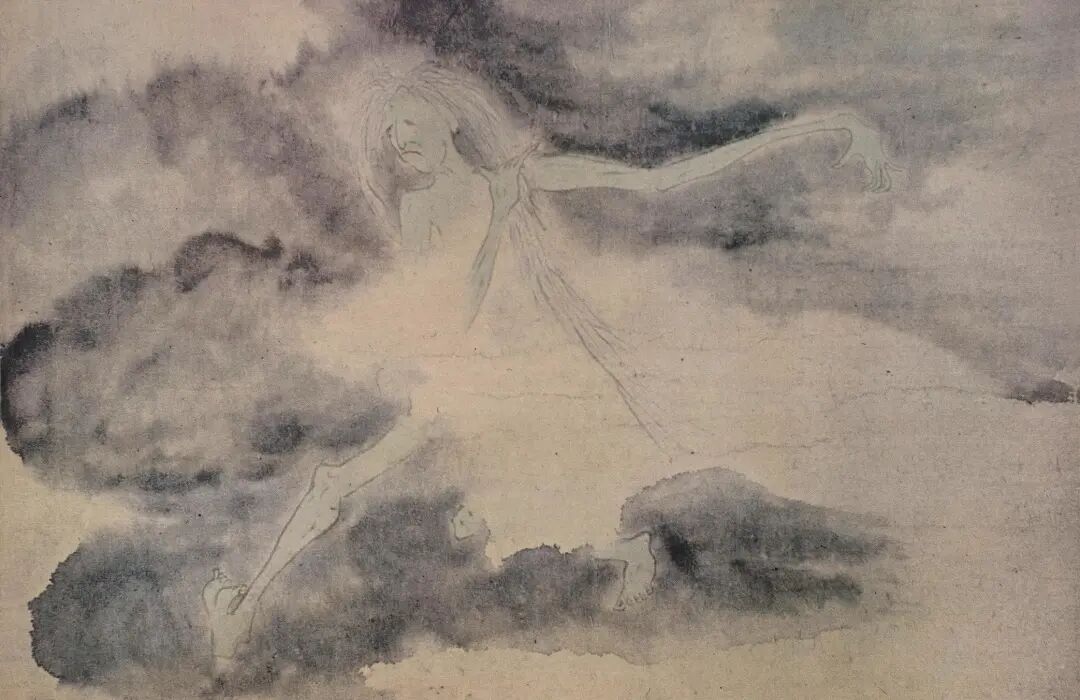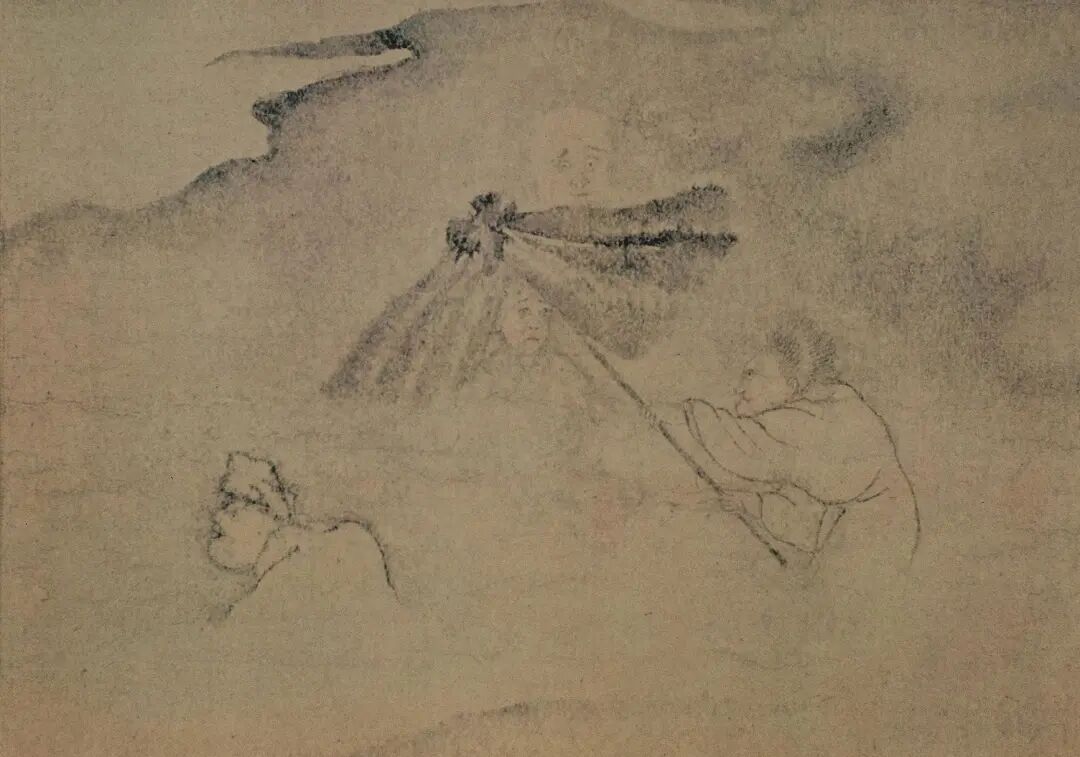 清道光学者吴修在《青霞馆论画绝句百》记载:“罗两峰之鬼趣图八幅,画时先以纸素晕湿,后乃施墨色,随笔毫之到处,辄成幽怪相,自饶别趣。”罗聘汲取金农的烂漫笔意,又上取陈洪绶白描人物画之高古意蕴。所用湿画法,在墨色未干时细笔勾画鬼魅形态,线条随着水气在画面浓雾渲染中相互渗透,充分展现鬼影婆娑的疏离感、与鬼魅跳动穿梭的灵趣,拉开画面鬼形象实与虚的对立关系。