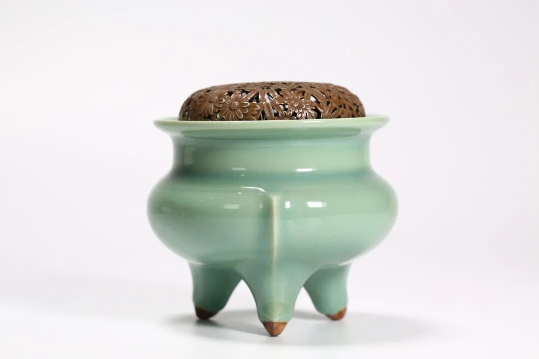 京烧名家【初代三浦竹泉】作 天蓝釉鼎式香炉纯银祥云纹火舍
