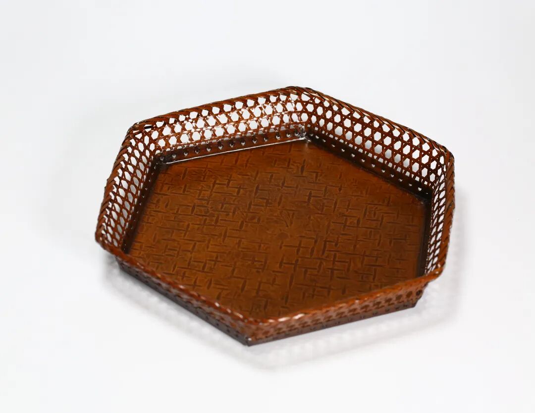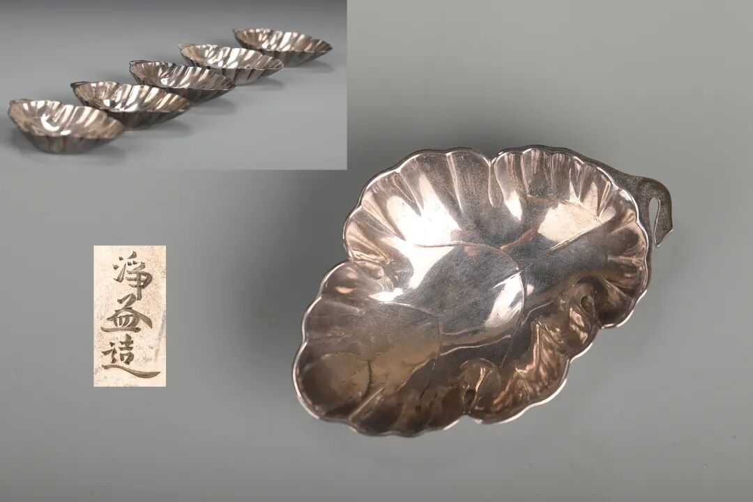 【金谷五郎三郎】作黄铜打出内镀银 彫叶纹平锅