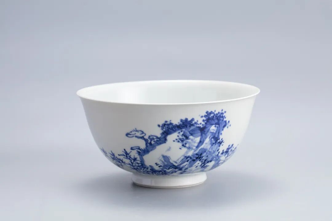 京烧名家【二代三浦竹泉】作 青花山水纹主人杯一对