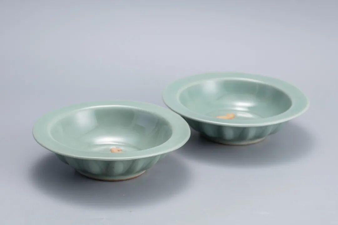 帝室技艺员【初代诹访苏山】作 青瓷双鱼小钵/壶承一对