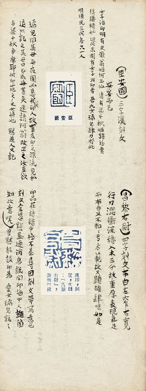 璚儿同其母,每夜阑必恳我谈印人故事及印之源流,儿私退则记之。其母曰:“已成册书矣,速请阿翁改正之。”汝直欲与梁千秋争席耶?何印苑之乏女将也?默道人又记。