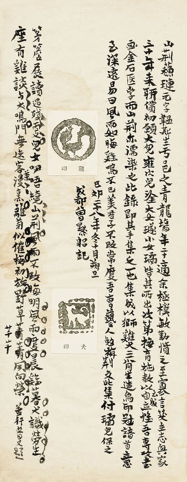 山荆苏琏元,字韫斯,生于邑之青龙场,年二十适余,极朴敏,勤愤(奋)之至,寡言笑。立志兴家,三十年来聊偿初愿。大儿雍,次儿淦,大女璲,小女璚,皆其所出,次第抚育施教以至成立。惟吾专攻书、画、金石、医学,而山荆亦濡染之, 此录即其手集之一也。集成以狮、鸡、犬三肖生造象印,冠诸首。意至深远, 《易》曰:“风雨如晦,鸡鸣不已。”美君子不改常度。吾曹艺人勉旃。荆父此集付璚儿保之。己卯二十八年(一九三九)冬十月朔旦,成都曾默躬记。