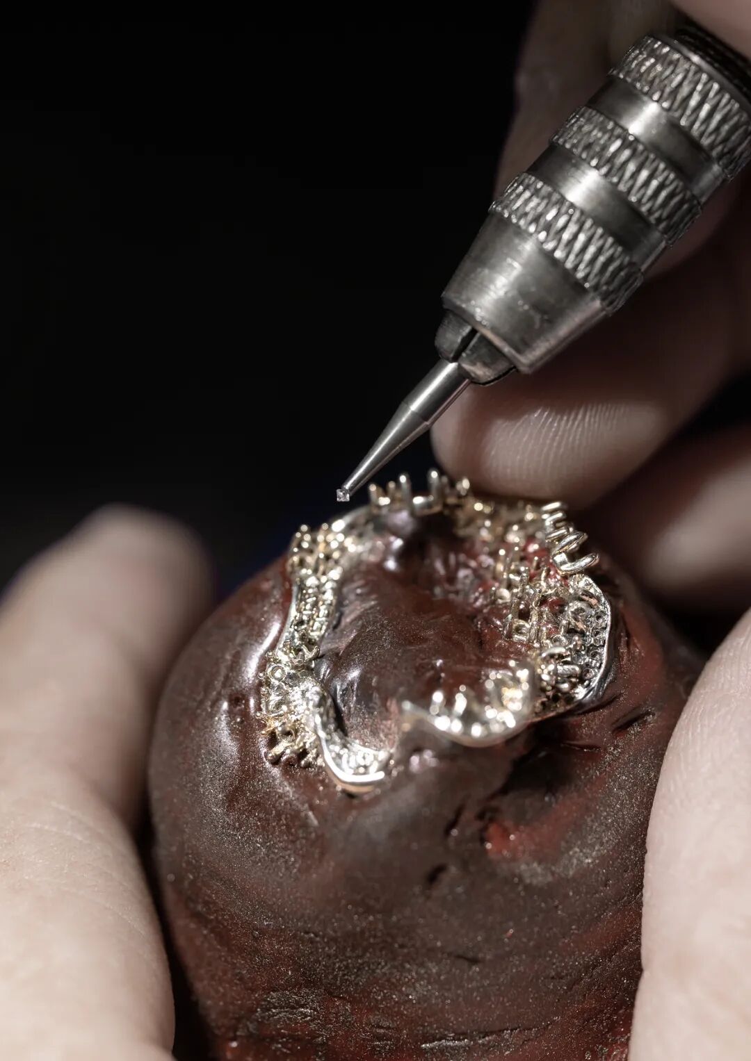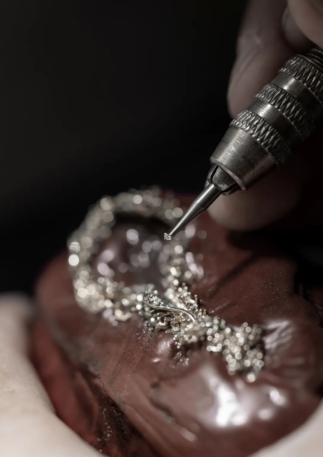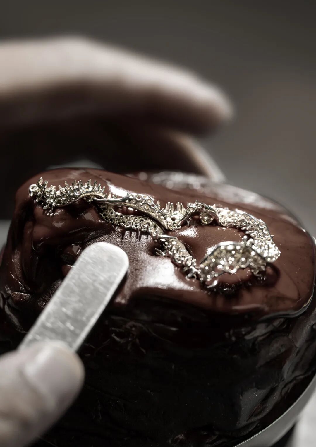 逐月系列耗时六个月完成,以银质铸造模型,以确定每颗宝石的镶嵌位置和角度,最后以贵金属打造出月光下湖面充满流动感的立体造型,迷人又真实。