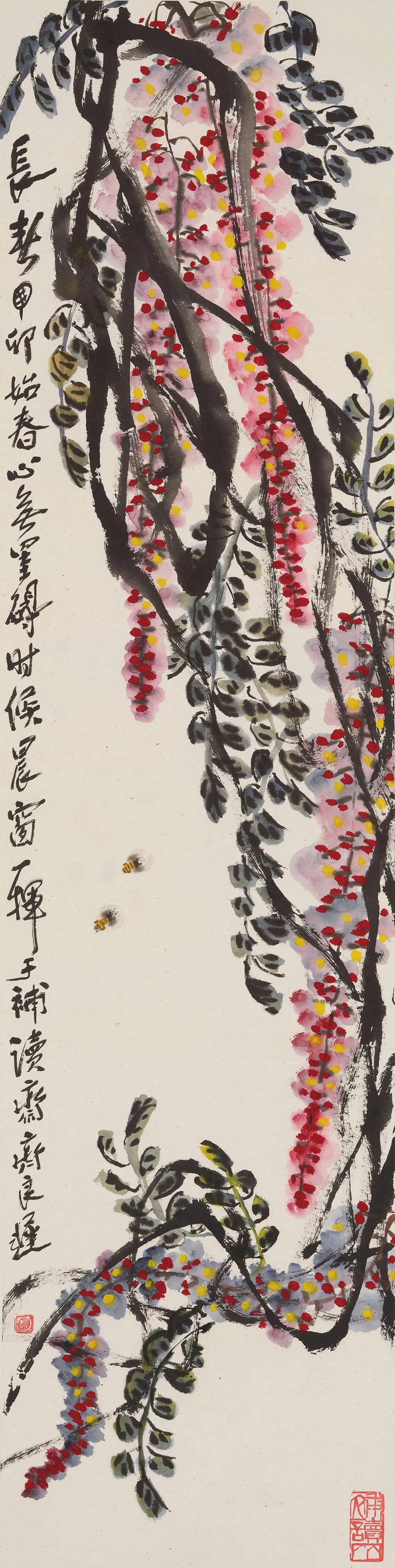 题识:长春。丁卯始春,心无挂碍时候晨窗一挥,于补读斋,齐良迟。