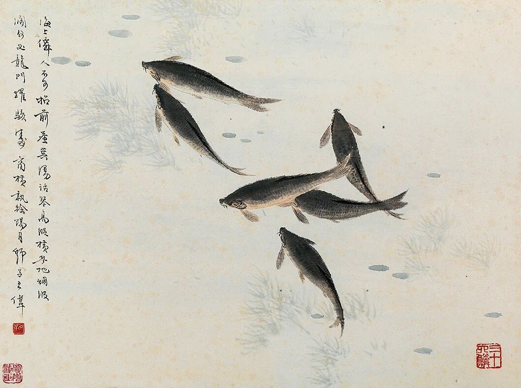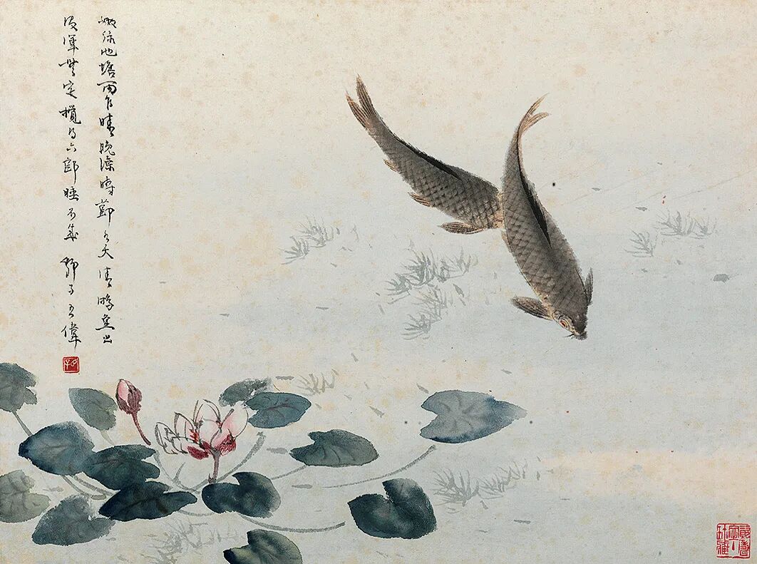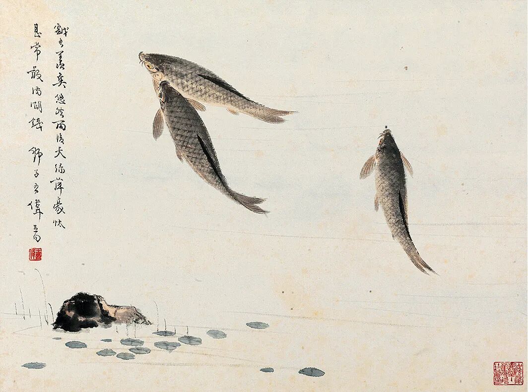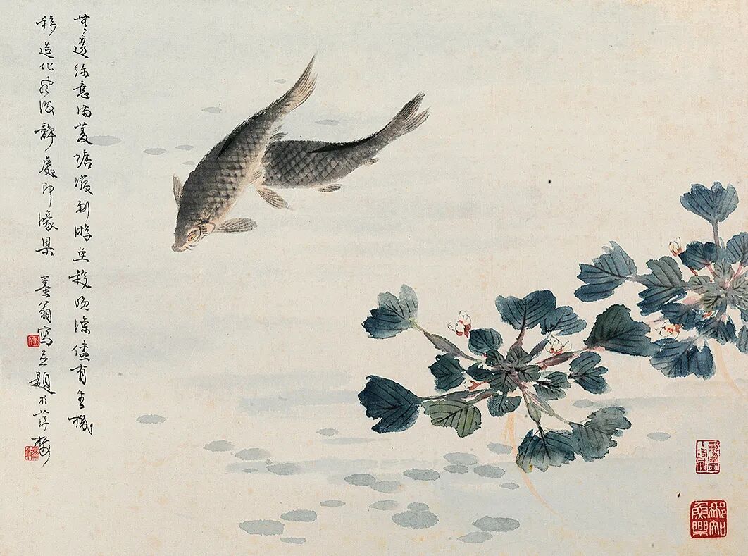 无边绿意满菱塘,泼剌游鱼趁晚凉,尽有生机移造化,风波静处即濠梁。墨翁写并题于萍楼。