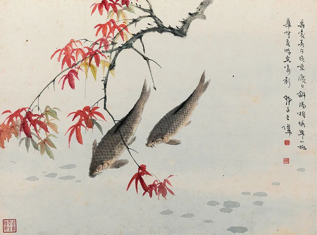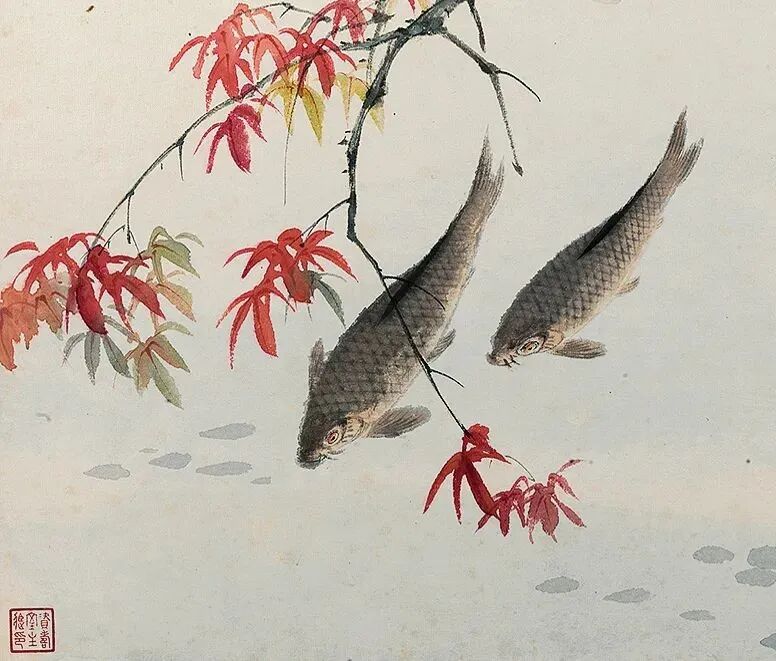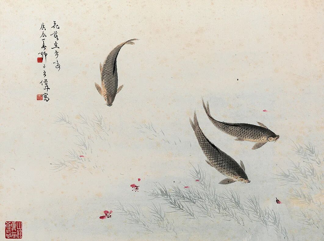 莫爱吴江晚景,渡口斜阳相映。点点似桃花,无数游鱼唼影。师子王伟。