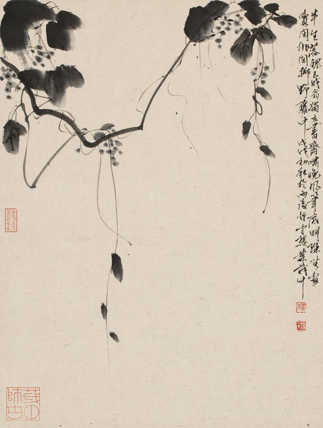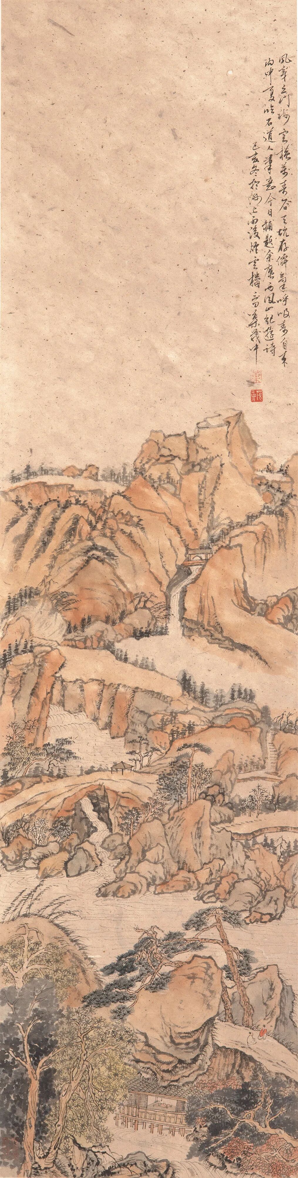 老叶之于抱石皴法,已然熟练到堪能乱真。我曾以他画的局部示于业内人士,多误以为纯系傅家笔墨。抱石皴之要,是融合了石涛与南宋禅画的笔墨,又借鉴了日本画的晕染,独用散锋,以乱而成章、狂中见理胜。其要旨,更在于深润酣畅中求浑沦苍茫。我的理解,散锋并不难,胆量而已,然而散锋纷乱能粗鲁求笔、狂怪求理,撷其大要,取其意到,于聚散疏密中见蹊径虚实,终而绝处逢生、出人意表,却谓难上难,足称斩关手!仅靠胆量又曷能臻此?老叶是深谙此中三昧的,他作抱石皴,散笔已是熟能生巧、游刃有余,难得的是他并未就此止步,这就足证他的野心。老叶上溯石涛,说明他已不满足于一家成法,而是要追溯抱石皴的理路之源。他最终追到了王蒙,追到了山水笔墨浑沦苍茫的始祖。![]()