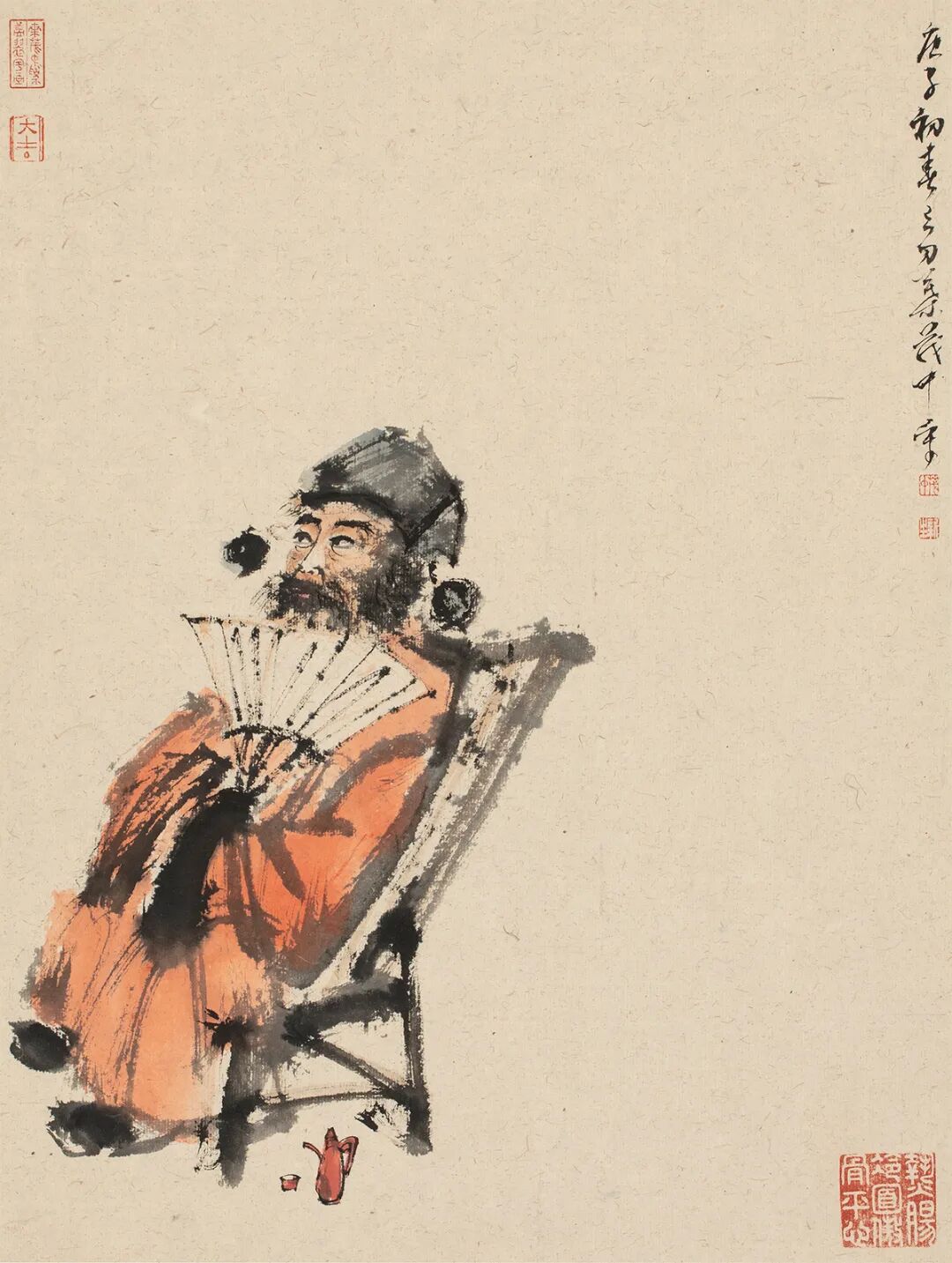 当时,叶茂中头戴一顶别着五角星的帽子,帽沿压得很低,手臂健壮,一看就知道是个练家子。他话不多,给人的感觉非常酷。他的形象,让我这个资深健身爱好者顿时有了亲近感。最有趣的是一言不合,他就叫来自己酷得从不搭理人的大胡子司机给毛毛表演俯卧撑,一做居然还没完没了……那画面,顿时让大家欢乐起来,特别符合毛毛爱搞怪的口味。后来才知道,他身边的工作人员都被他要求健身,几乎每人都是内行。一同出差在机场登机前,他会要求员工挨个做俯卧撑,让人听后忍俊不住。当时给我的感觉是,此公虽有点神神叨叨,人却非常有趣,心想大概是他做策划的职业习惯吧。再后来,偶然见到毛毛在朋友圈里转发过他的画作,让我这个笔墨圈滚了几十年的小老炮着实吃了一惊。老叶不但画得专业,而且从为数不多的几张照片中我能看出,他在师承上有着明确的选择,或者说是清晰的见解。换句话说,叶茂中绝不是随意抹几笔抒写性情的玩家。说得直白点,他其实是个有着勃勃野心,意欲会心先贤的画家。![]()