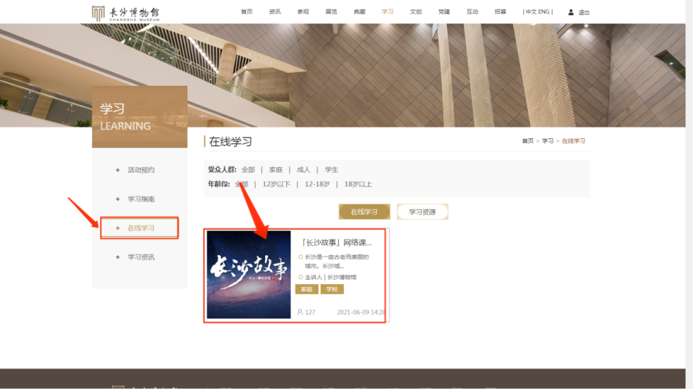 2.进入“在线学习”板块,点击进入【长沙故事】网络课程。