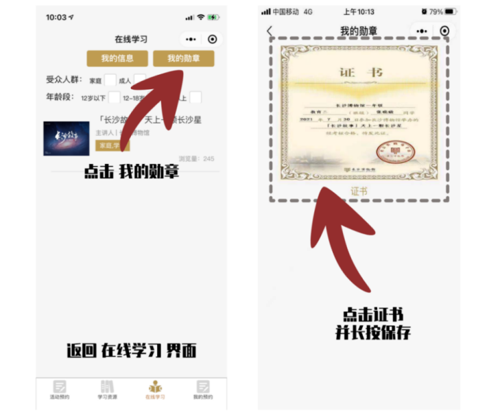 6.请保存好证书截图,可作为学生参与长沙博物馆寒假社会实践活动证明(包含寒假社会实践电子章)。