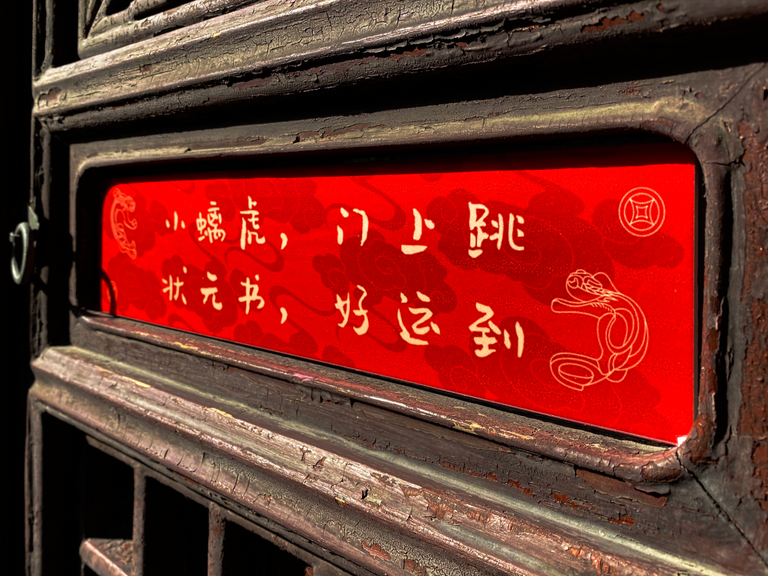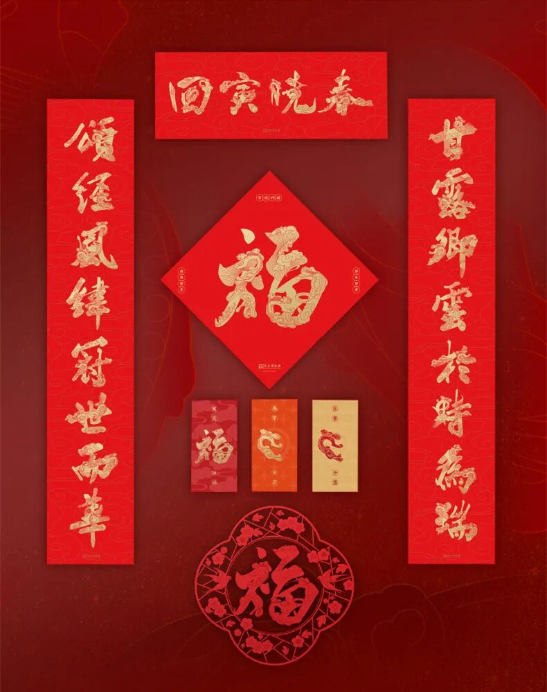春联的设计,也有巧思包含在内。春联上的每个字,都有螭虎及其他代表福禄寿喜涵义的元素,寓意福禄双全、健康平安。