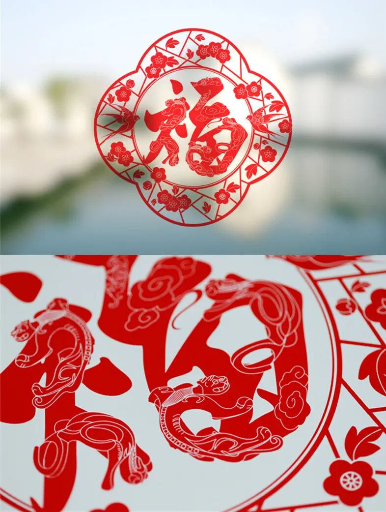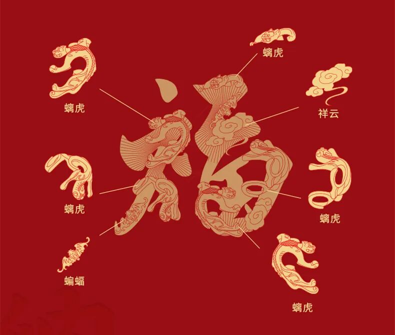 以“福”为例。“福”字由五只形态各异的螭虎、蝙蝠及祥云盘旋而上,寓“五福临门”,周围环绕春联的吉祥语句,福上添福。