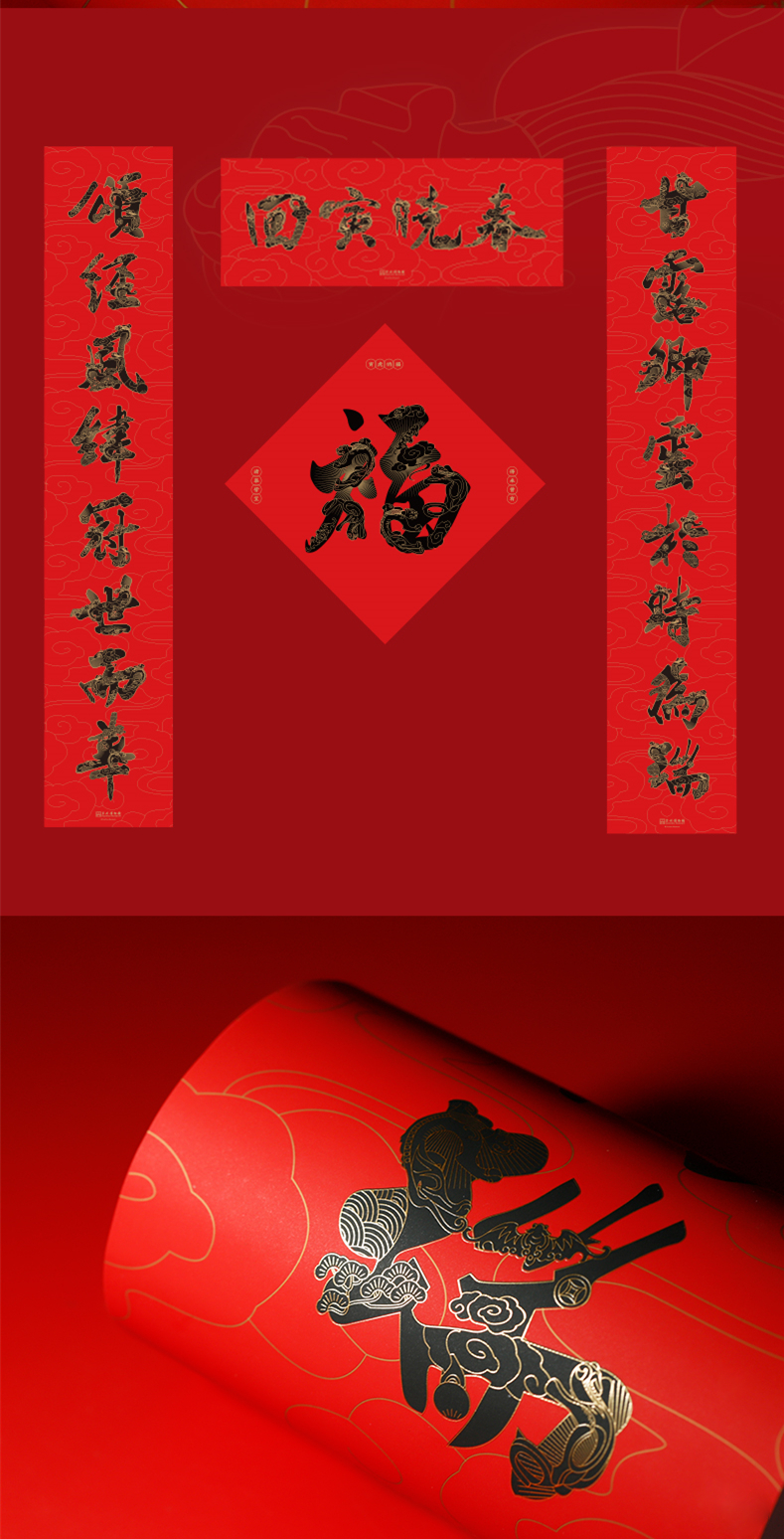 我们旨在学习苏作匠人的精神,反复挑选合适的纸张,最终选择了这款细腻的触感纸作为春联的材料;文字部分采用凸金工艺,增加了立体感,华丽不失稳重。