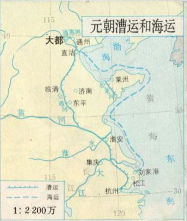 因此,以至元十三年那次试行的海运为契机,在整建传统运河的同时,元廷于至元十九年收编“海盗”朱清、张瑄二人,与上海总馆罗璧“造平底海船六十艘,运粮四万六千余石,从海道至京师”。自此之后,元代海运道路又经过了两次改良,终于在至元三十年形成了从太仓刘家港等地起航至天津界河口(以下再经运河抵达大都)的海上航道,顺风10日即可完成全部航程。