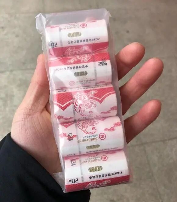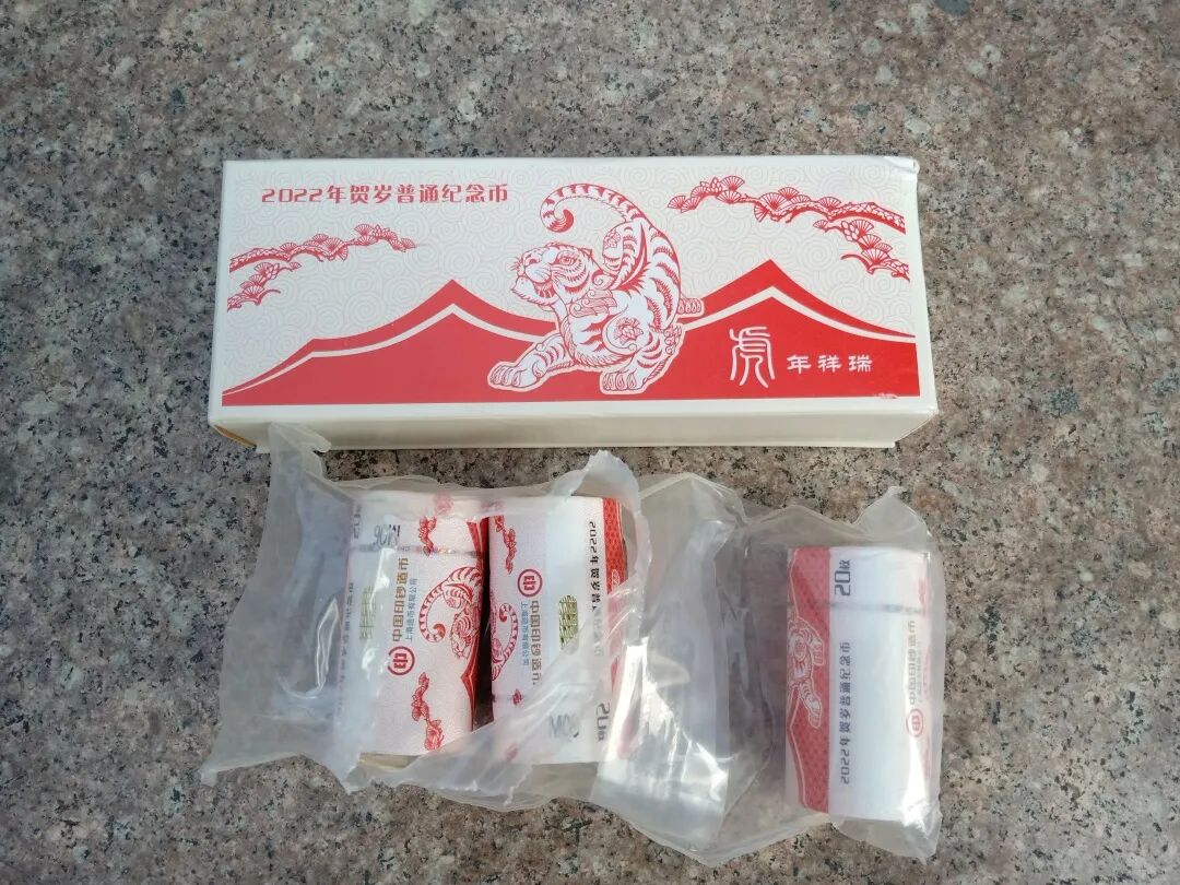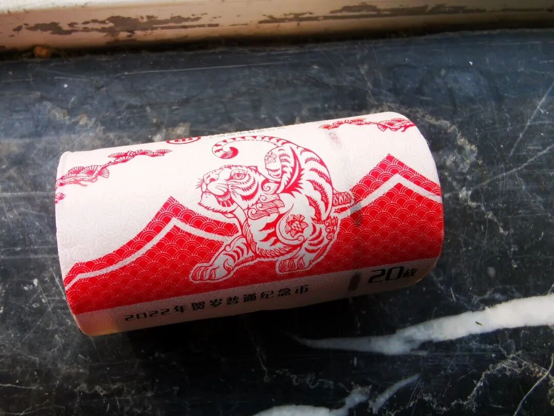 虎币的包装延续了牛年纪念币的设计,依旧采用了春节火红喜庆氛围的山楂卷。一卷20枚,一盒5卷。