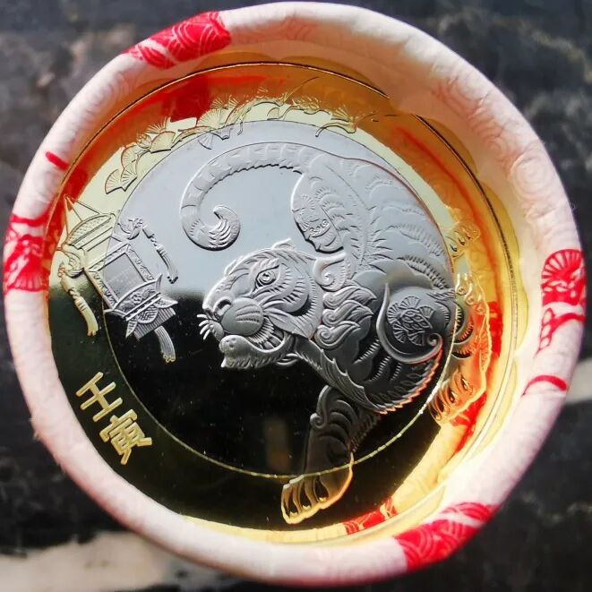 虎年纪念币实物果然没让人失望,非常好看!采用双金属结构,硬币外环为黄铜合金,内芯为具有独特机读性能的镍带复合白铜材料。