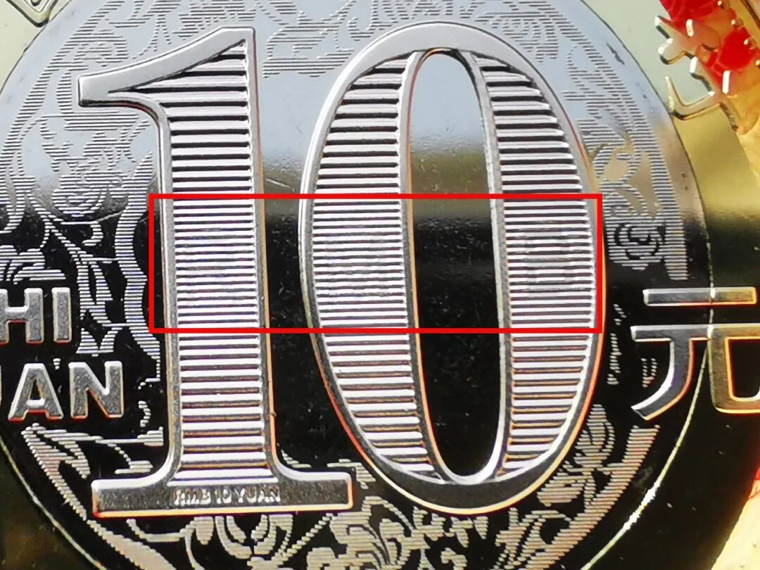 纪念币正面的面值“10”的轮廓线里倾斜角度,观察到两组由 3 个“10”和“RMB”构成的隐形图文。