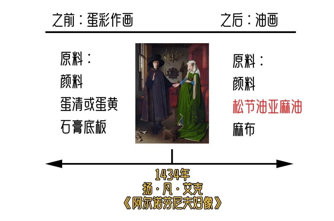 在这幅之前,人们大多选用蛋彩作画,到了扬·凡·艾克这,他采用了松节油作为颜料调和剂。