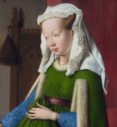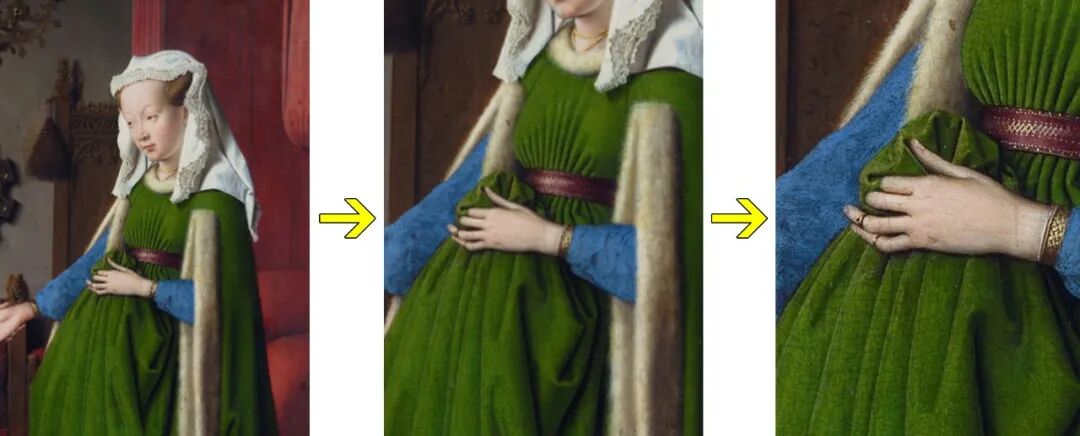 阿尔诺芬尼夫人将繁琐的大裙摆层层叠叠折在肚子前,这个从视觉上看来像个准孕妇的打扮,其实不过是当时比利时贵族最时髦的大裙摆造成鼓鼓的感觉。