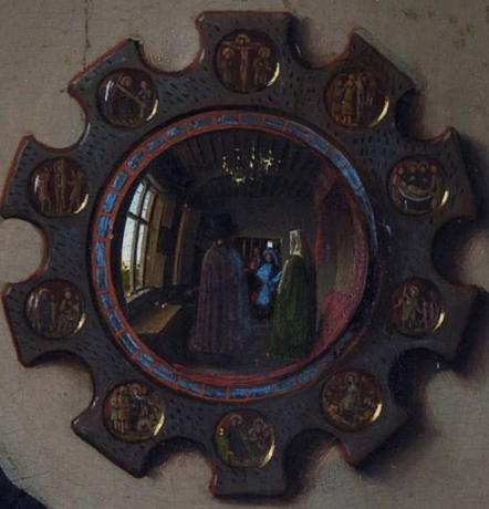 还没完呢,调皮的画家本人扬·凡·艾克利用镜子把自己作为见证者的身份给藏到画里面去了!