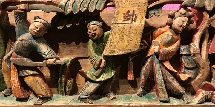 也有来自老宅和寺庙的精美木雕。或许它们的色彩已在岁月冲刷下逐渐斑驳,但但精致考究的雕工刻画出来的人物依然栩栩如生地为我们叙说着古代戏曲神话中一众忠臣名将、才子佳人的传奇故事。