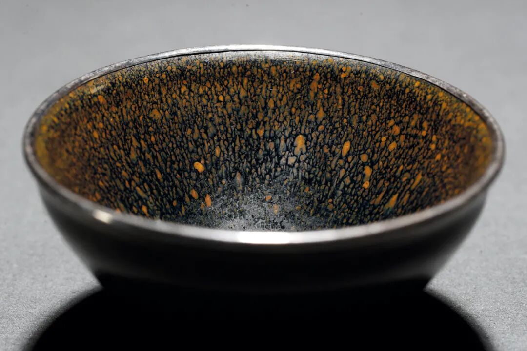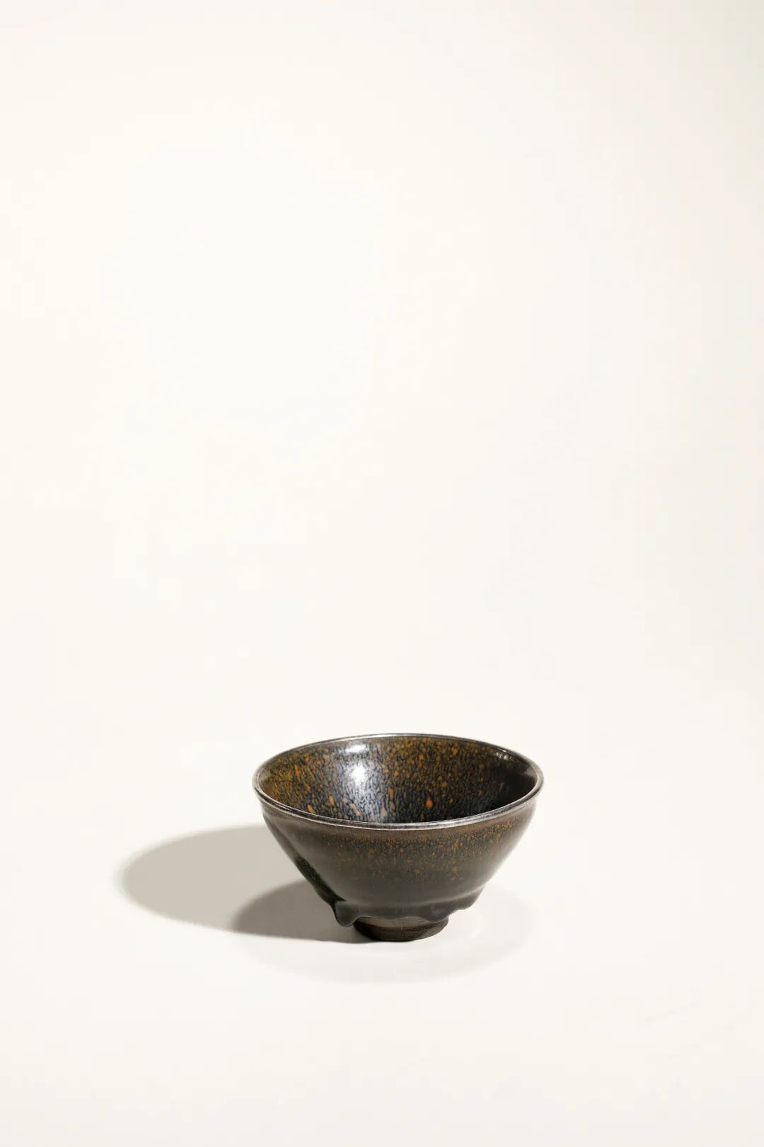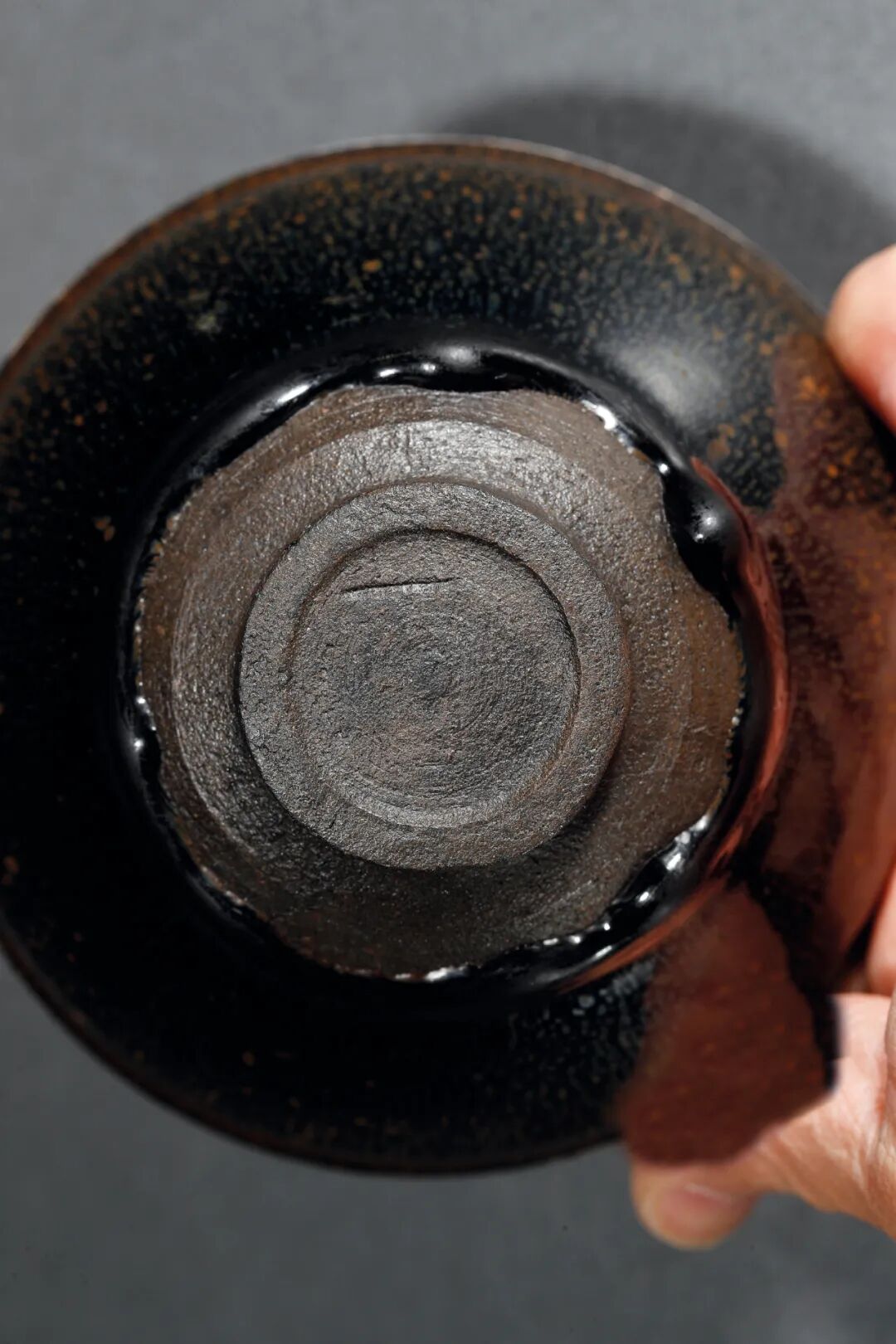 此盏造型撇口纤腹,弧线优美。罩施黑釉,色泽深沈悠远,盏壁外刷釉至中腹,足部露胎,胎骨质坚,呈煤黑色。盏内外可见大大小小呈圆形的斑点,似油滴状,又似天幕中的繁星点点。