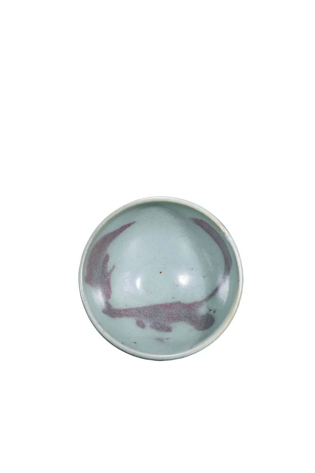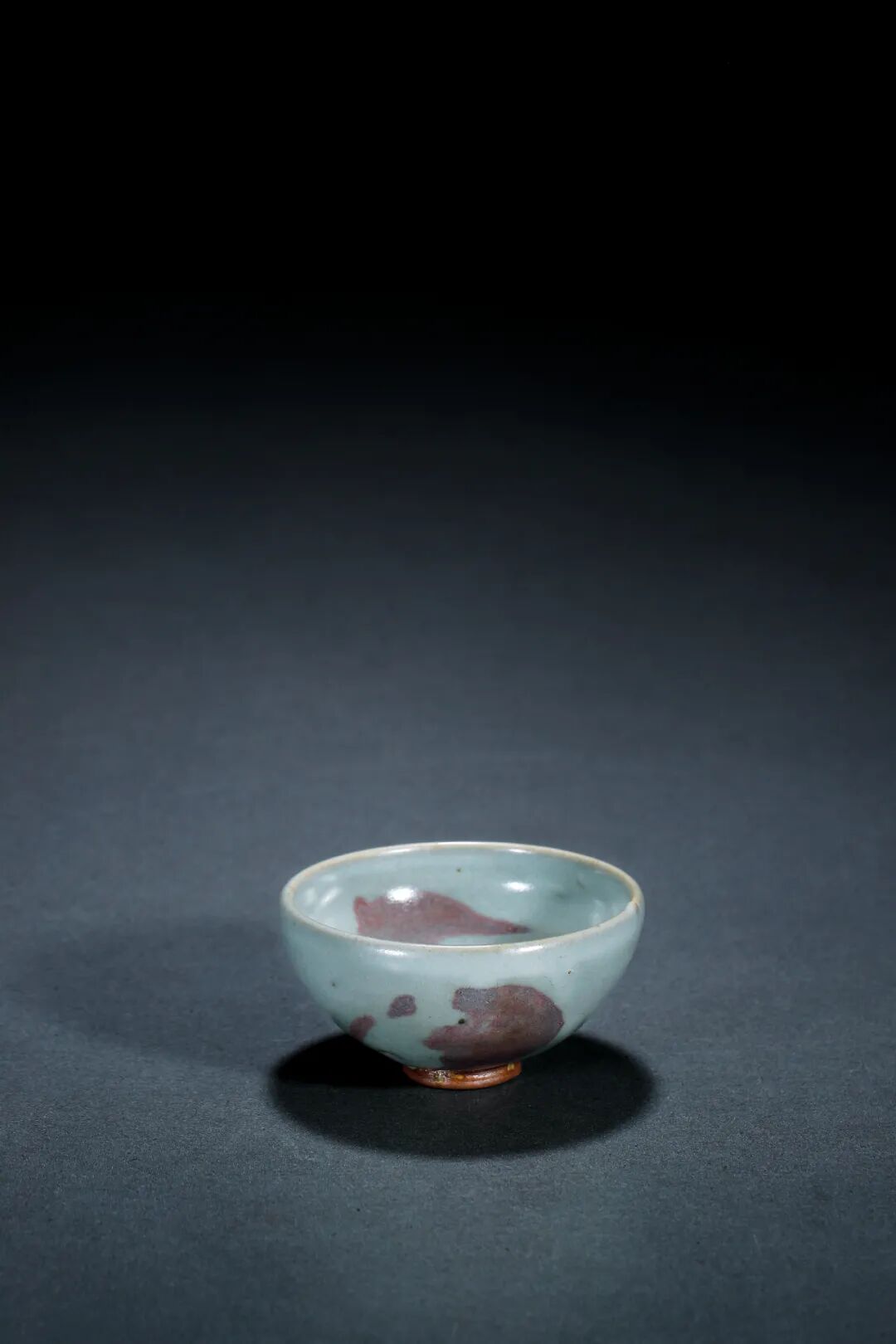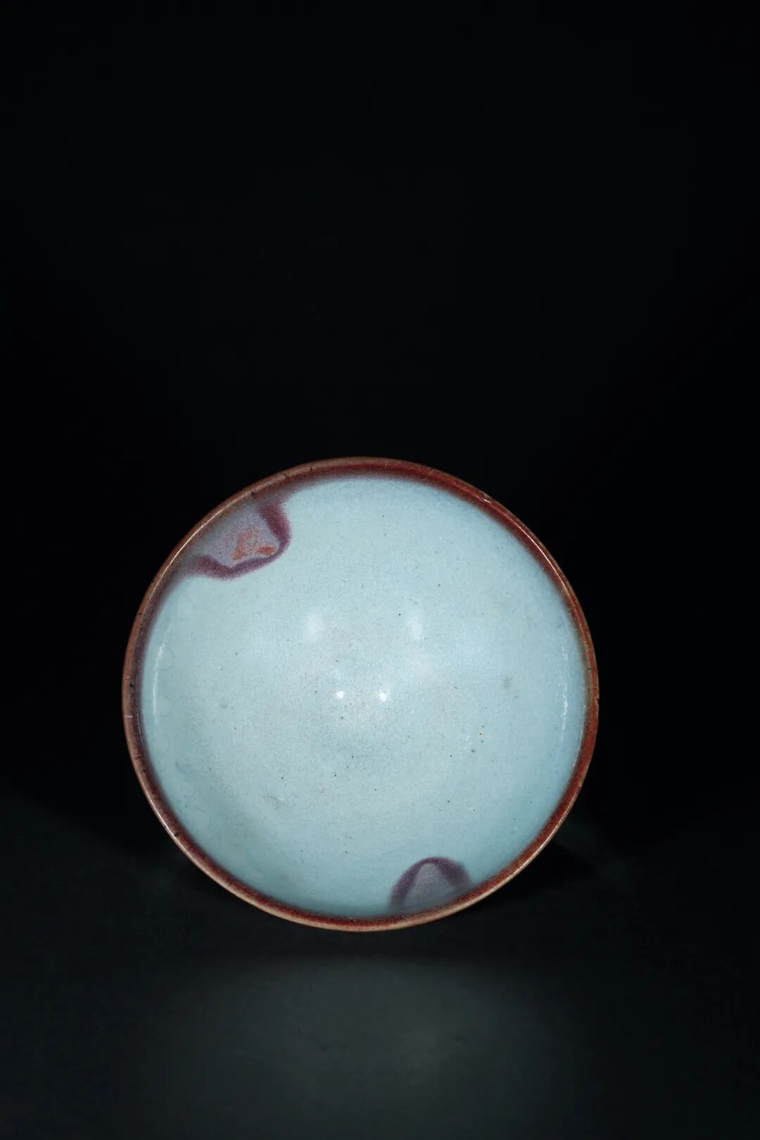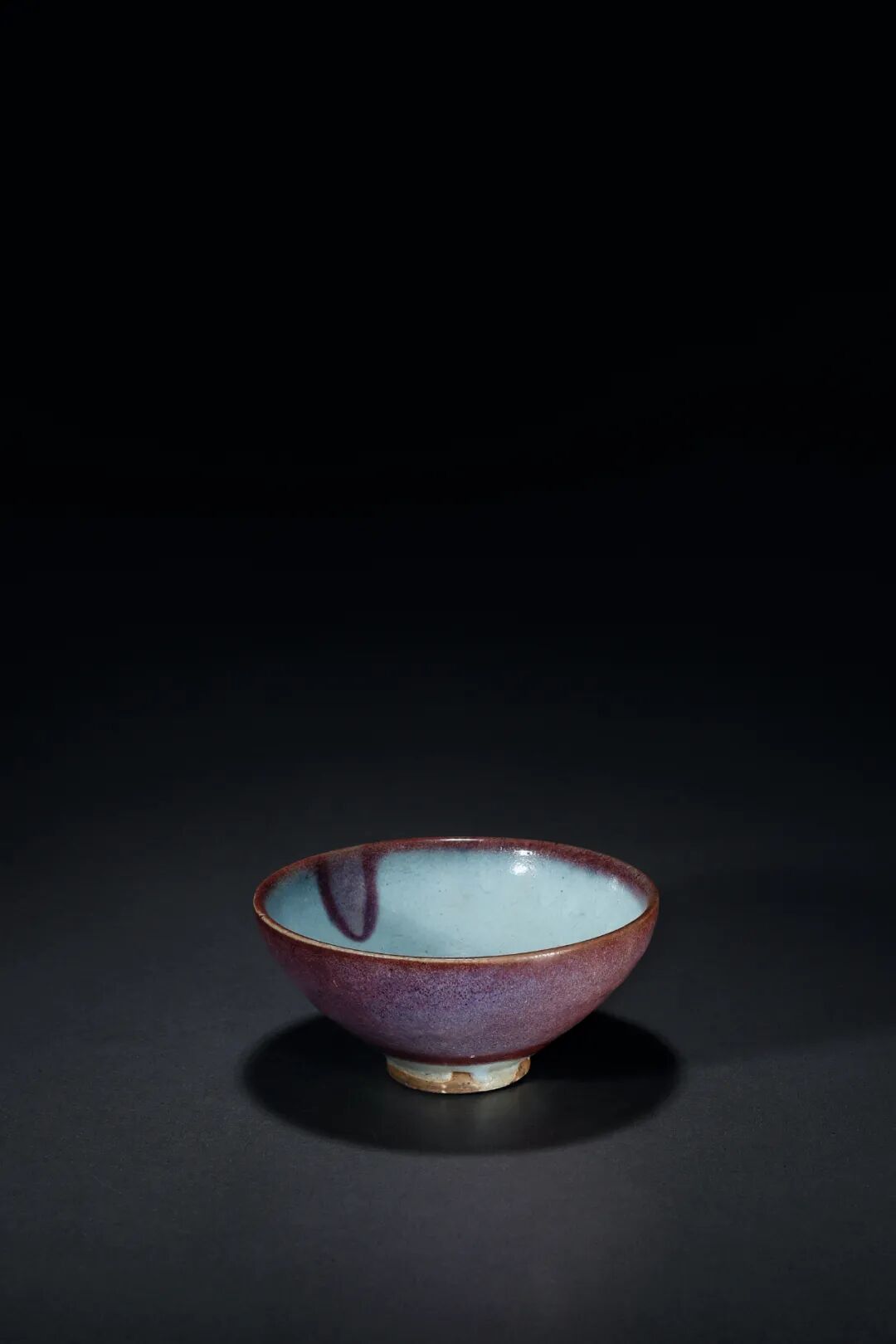 碗内为典型的天蓝色,静穆湉谧;碗外紫斑晕融烂漫,既如暴雨淋墙,斑驳相连,又如雨后青山,云烟氤氲,古韵十足,正合寂园叟《陶雅》中所说:“钧窑之紫,汗浸全体,晕成一片”。