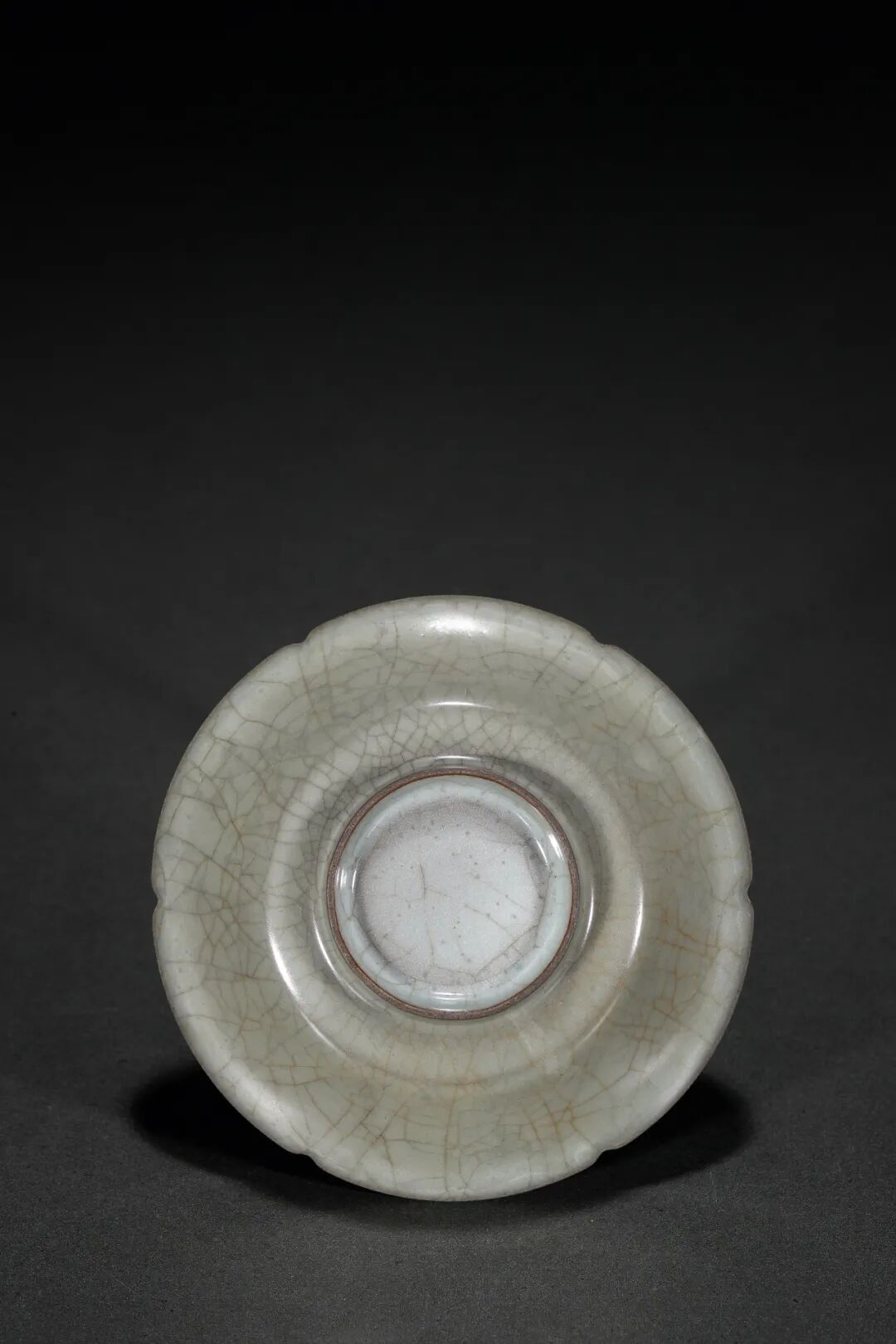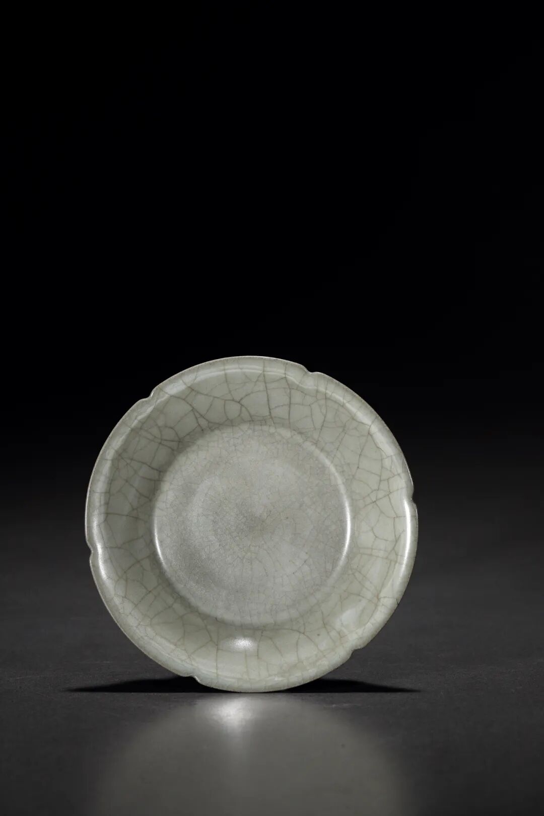盘六瓣花口,口沿向外翻折,弧壁渐收,平底。整器施官釉,釉色温润柔和,器内外满布细碎开片。开片大小不一,本品造型别致典雅,荡漾着隽美秀润之气。