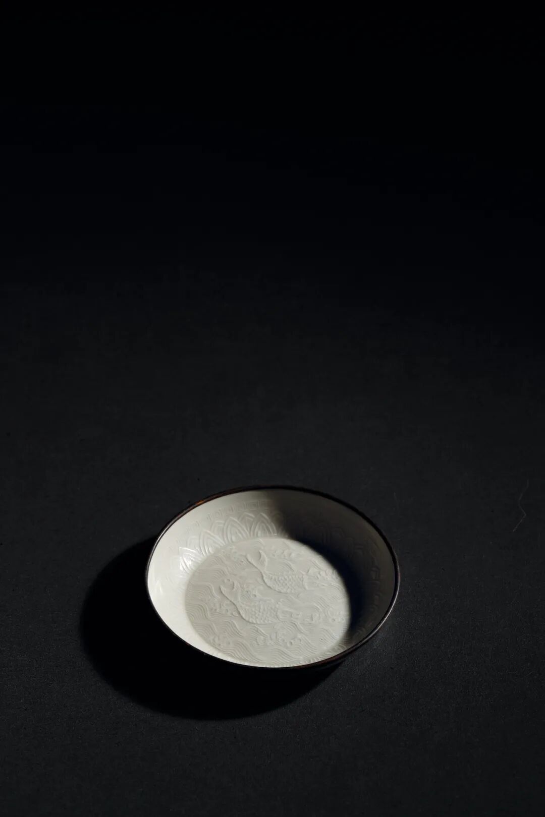 此洗敞口,口沿旧镶铜扣,浅弧腹,平底,造型规整。通体施白釉,釉面油润有光泽,内壁印花回文、蕉叶纹装饰带一周,洗心印花双鱼纹,身姿灵动,并辅以细密的水波纹,纹饰精细,繁复而不失典雅。